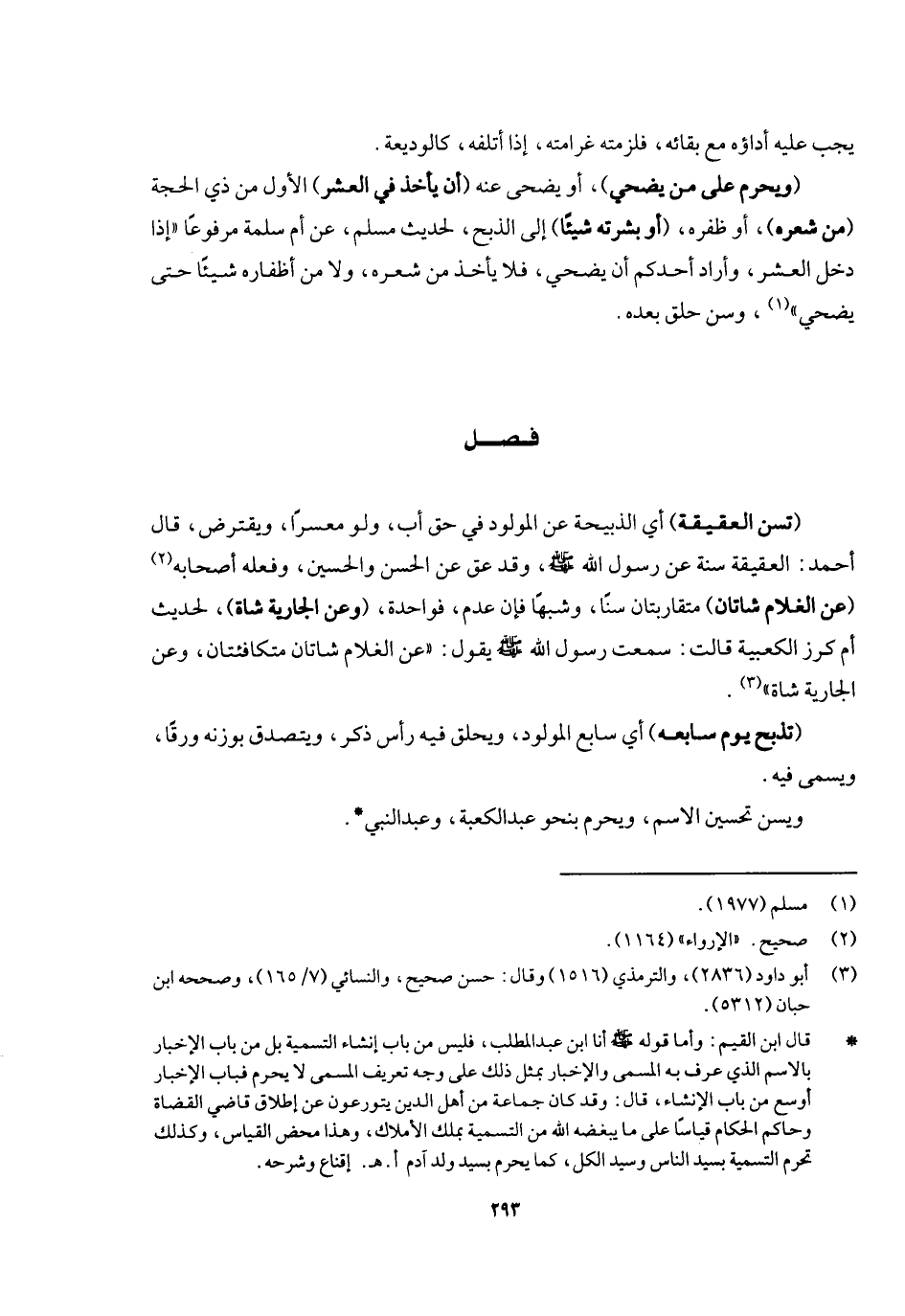 (تذبح يوم سابعه) أي سابع المولود، ويحلق فيه رأس ذكر ويتصدق بوزنه ورقا ويسمى فيه، ويسن تحسين الاسم، ويحرم بنحو عبد الكعبة وعبد النبي،