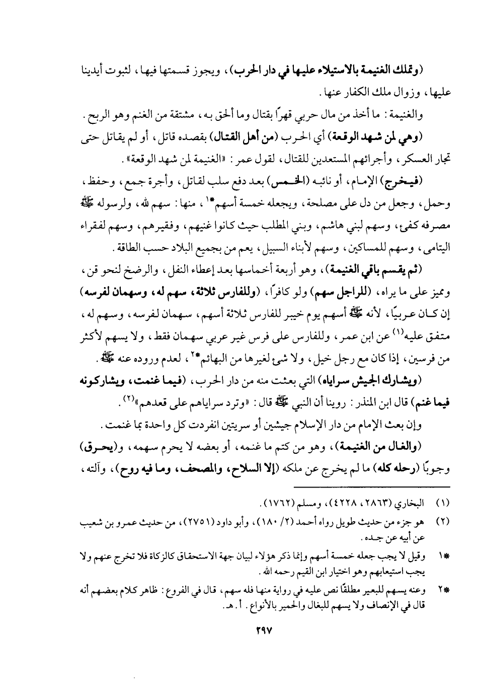 والغنيمة: ما أخذ من مال حربي قهرا بقتال وما ألحق به مشتقة من الغنم وهو الربح، (وهي لمن شهد الوقعة) أي الحرب (من أهل القتال) بقصده قاتل أو لم يقاتل حتى تجار العسكر وأجرائهم المستعدين للقتال لقول عمر: " الغنيمة لمن شهد الوقعة " (فيخرج) الإمام أو نائبه (الخمس) بعد دفع سلب لقاتل وأجرة جمع وحفظ وحمل وجعل من دل على مصلحة، ويجعله خمسة أسهم، منها سهم لله ولرسوله - صَلَّى اللَّهُ عَلَيْهِ وَسَلَّمَ - ومصرفه كفيء، وسهم لبني هاشم وبني المطلب حيث كانوا غنيهم وفقيرهم، وسهم لفقراء اليتامى، وسهم للمساكين، وسهم لأبناء السبيل يعم من بجميع البلاد حسب الطاقه (ثم يقسم باقي الغنيمة) وهو أربعة أخماسها بعد إعطاء النفل والرضخ لنحو قن ويميز على ما يراه (للراجل سهم) ولو كافرا (وللفارس ثلاثة أسهم سهم له وسهمان لفرسه) إن كان عربيا؛ لأنه
