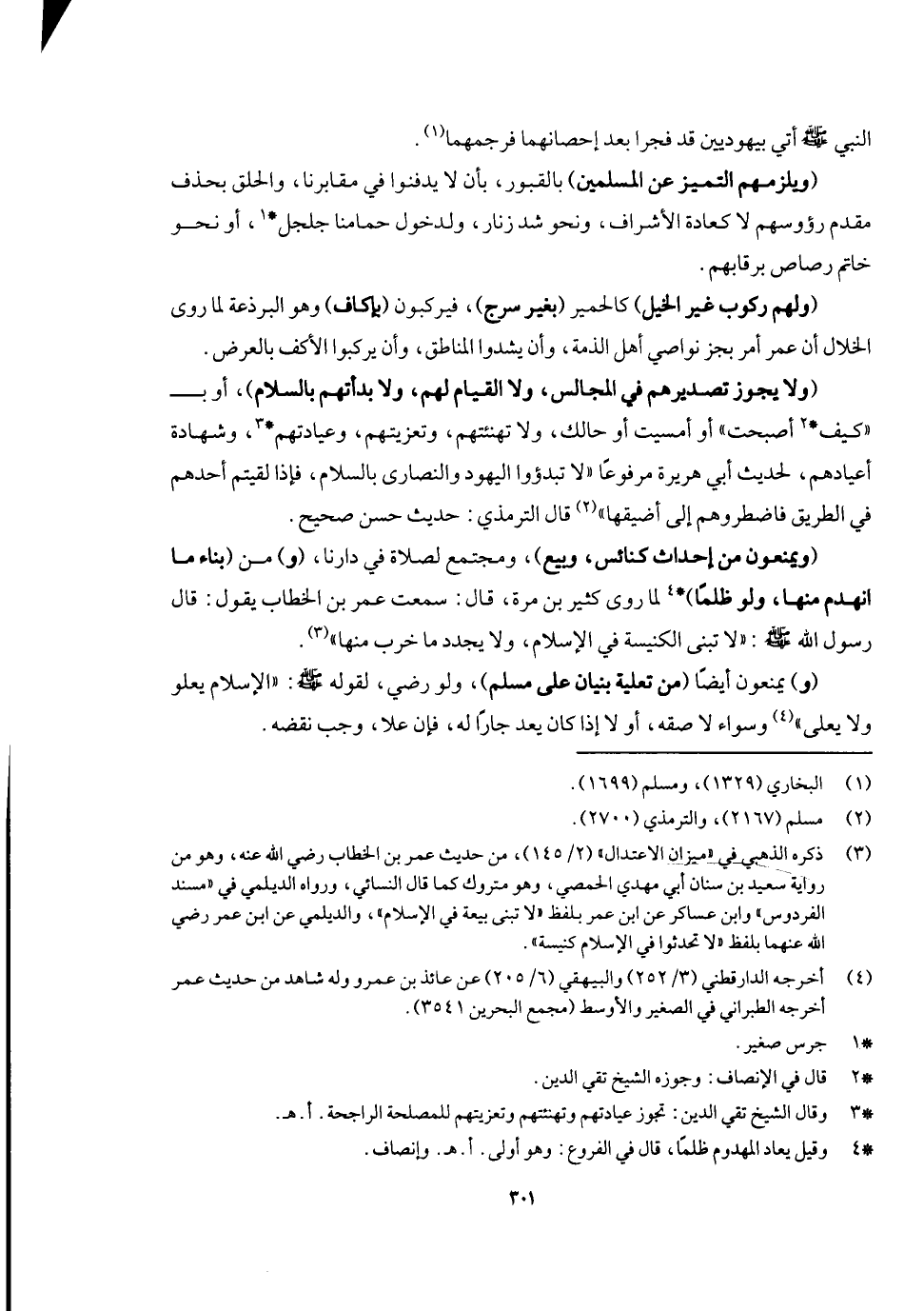 (ويلزمهم التميز عن المسلمين) بالقبور بأن لا يدفنوا في مقابرنا والحلي بحذف مقدم رؤوسهم لا كعادة الأشراف ونحو شد زنار، ولدخول حمامنا بجلجل أو نحو خاتم رصاص برقابهم، (ولهم ركوب غير الخيل) كالحمير (بغير سرج) فيركبون (بإكاف) وهو البرذعة لما روى الخلال أن عمر أمر بجز نواصي أهل الجزيرة، وأن يشدوا المناطق وأن يركبوا الأكف بالعرض.