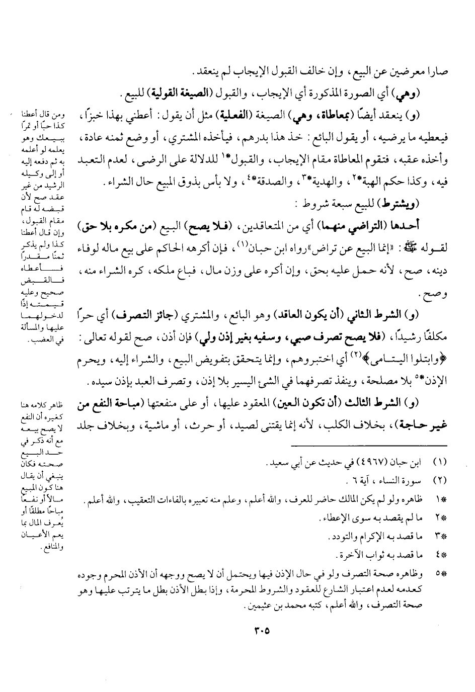 أحدها: التراضي منهما) أي من المتعاقدين (فلا يصح) البيع (من مكره بلا حق) لقوله - صَلَّى اللَّهُ عَلَيْهِ وَسَلَّمَ -: «إنما البيع عن تراض» رواه ابن حبان، فإن أكرهه الحاكم على بيع ماله لوفاء دينه صح لأنه حمل عليه بحق، وإن أكره على وزن مال فباع ملكه كره الشراء منه وصح.