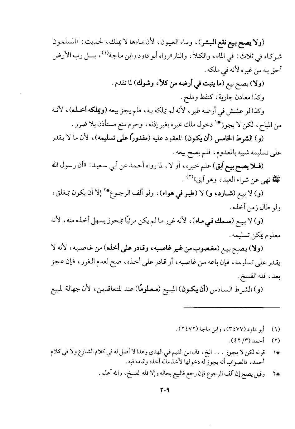 (ولا يصح بيع نقع البئر) وماء العيون لأن ماءها لا يملك لحديث: «المسلمون شركاء في ثلاث في الماء والكلأ والنار» رواه أبو داود وابن ماجه، بل رب الأرض أحق به من غيره لأنه [صار] في ملكه، (ولا) يصح بيع ما ينبت في أرضه من كلأ وشوك) لما تقدم وكذا معادن جارية كنفط وملح، وكذا لو عشش في أرضه طير لأنه لا يملكه به فلم يجز بيعه (ويملكه آخذه) لأنه من المباح لكن لا يجوز دخول ملك غيره بغير إذنه، وحرم منع مستأذن بلا ضرر.