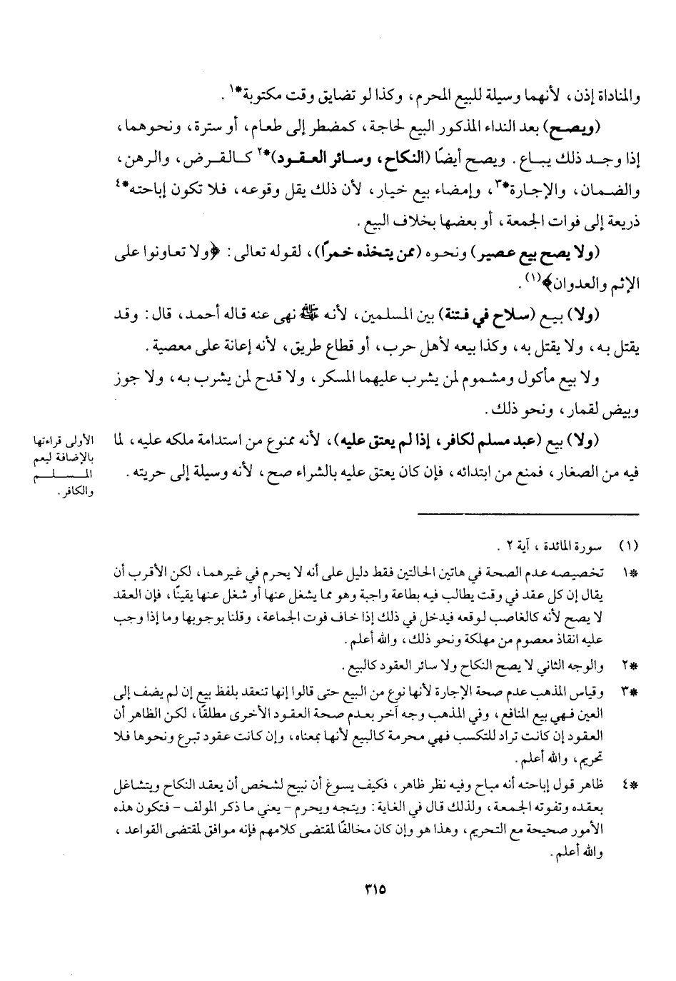 (ولا يصح بيع عصير) ونحوه ممن يتخذه خمرا) لِقَوْلِهِ تَعَالَى: {وَلا تَعَاوَنُوا عَلَى الإِثْمِ وَالْعُدْوَانِ} [المائدة: ٢] ، (ولا) بيع (سلاح في فتنة) بين المسلمين لأنه - صَلَّى اللَّهُ عَلَيْهِ وَسَلَّمَ - نهى عنه قاله أحمد، قال: وقد يقتل به، وكذا بيعه لأهل حرب أو قطاع طريق لأنه إعانة على معصية، ولا بيع مأكول ومشموم لمن يشرب عليهما المسكر، ولا قدح لمن يشرب به، خمرا ولا جوز وبيض لقمار، ويحرم أكله ونحو ذلك. (ولا) بيع عبد مسلم لكافر إذا لم يعتق عليه) لأنه ممنوع من استدامة ملكه عليه لما فيه من الصغار فمنع من ابتدائه، فإن كان يعتق عليه بالشراء صح؛ لأنه وسيلة إلى حريته.