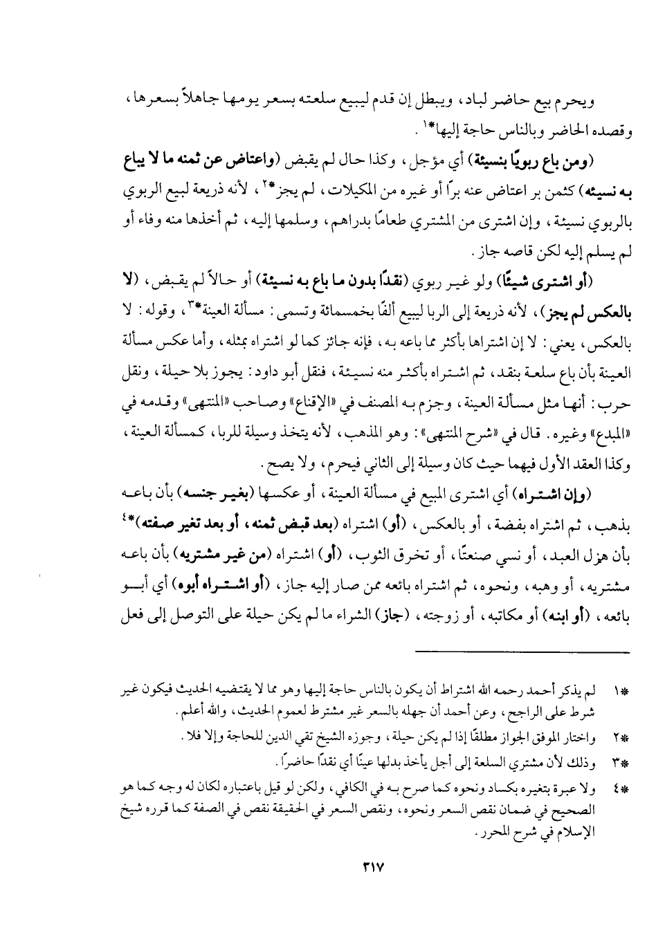 (ومن باع ربويا بنسيئة) أي مؤجل وكذا حال لم يقبض (واعتاض عن ثمنه ما لا يباع به نسيئة) كثمن بر اعتاض عنه برا أو غيره من المكيلات لم يجز؛ لأنه ذريعة لبيع الربوي بالربوي نسيئة، وإن اشترى من المشتري طعاما بدراهم وسلمها إليه ثم أخذها منه وفاء أو لم يسلمها إليه لكن قاصه جاز، (أو اشترى شيئا) ولو غير ربوي (نقدا بدون ما باع به نسيئة) أو حالا لم يقبض، (لا بالعكس لم يجز) لأنه ذريعة إلى الربا ليبيع ألفا بخمسمائة وتسمى: مسألة العينة، وقوله: بالعكس، يعني: لا إن اشتراه بأكثر مما باعه به فإنه جائز كما لو اشتراه بمثله، وأما عكس مسألة العينة بأن باع سلعة بنقد ثم اشتراه بأكثر منه نسيئة فنقل أبو داود: يجوز بلا حيلة، ونقل حرب: أنها مثل مسألة العينة، وجزم به المصنف في " الإقناع " وصاحب " المنتهى " وقدمه في " المبدع " وغيره.
