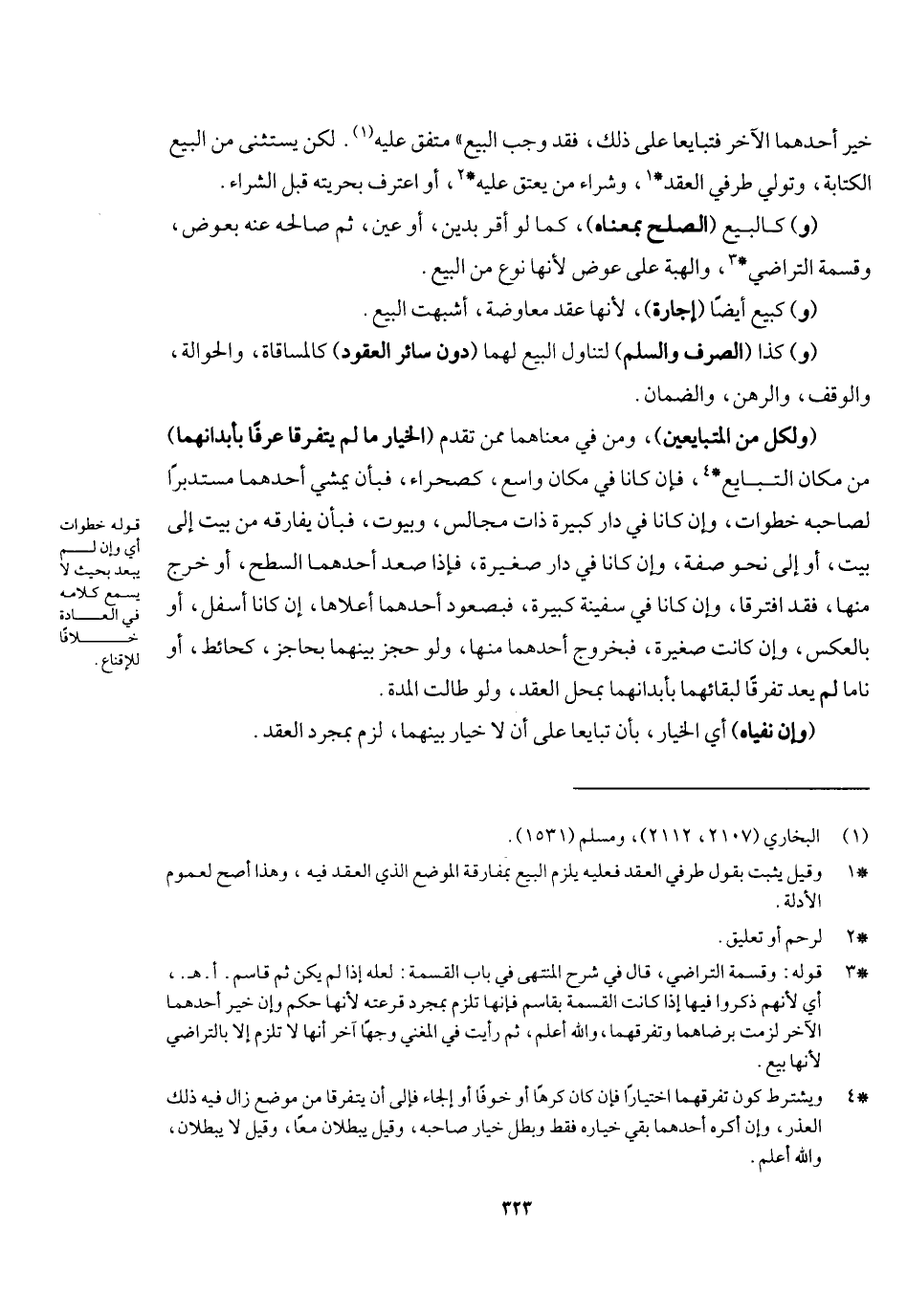 (ولكل من المتبايعين) ومن في معناهما ممن تقدم الخيار ما لم يتفرقا عرفا بأبدانهما) من مكان التبايع، فإن كانا في مكان واسع كصحراء فبأن يمشي أحدهما مستدبرا لصاحبه خطوات، وإن كانا في دار كبيرة ذات مجالس وبيوت فبأن يفارقه من بيت إلى بيت أو إلى نحو صفة، وإن كانا في دار صغيرة فإذا صعد أحدهما السطح أو خرج منها فقد افترقا، وإن كانا في سفينة كبيرة فبصعود أحدهما أعلاها إن كانا أسفل أو بالعكس، وإن كانت صغيرة فبخروج أحدهما منها، ولو حجز بينهما بحاجز كحائط أو ناما لم يعد تفرقا لبقائهما بأبدانهما بمحل العقد ولو طالت المدة، (وإن نفياه) أي الخيار بأن تبايعا على أن لا خيار بينهما لزم بمجرد العقد