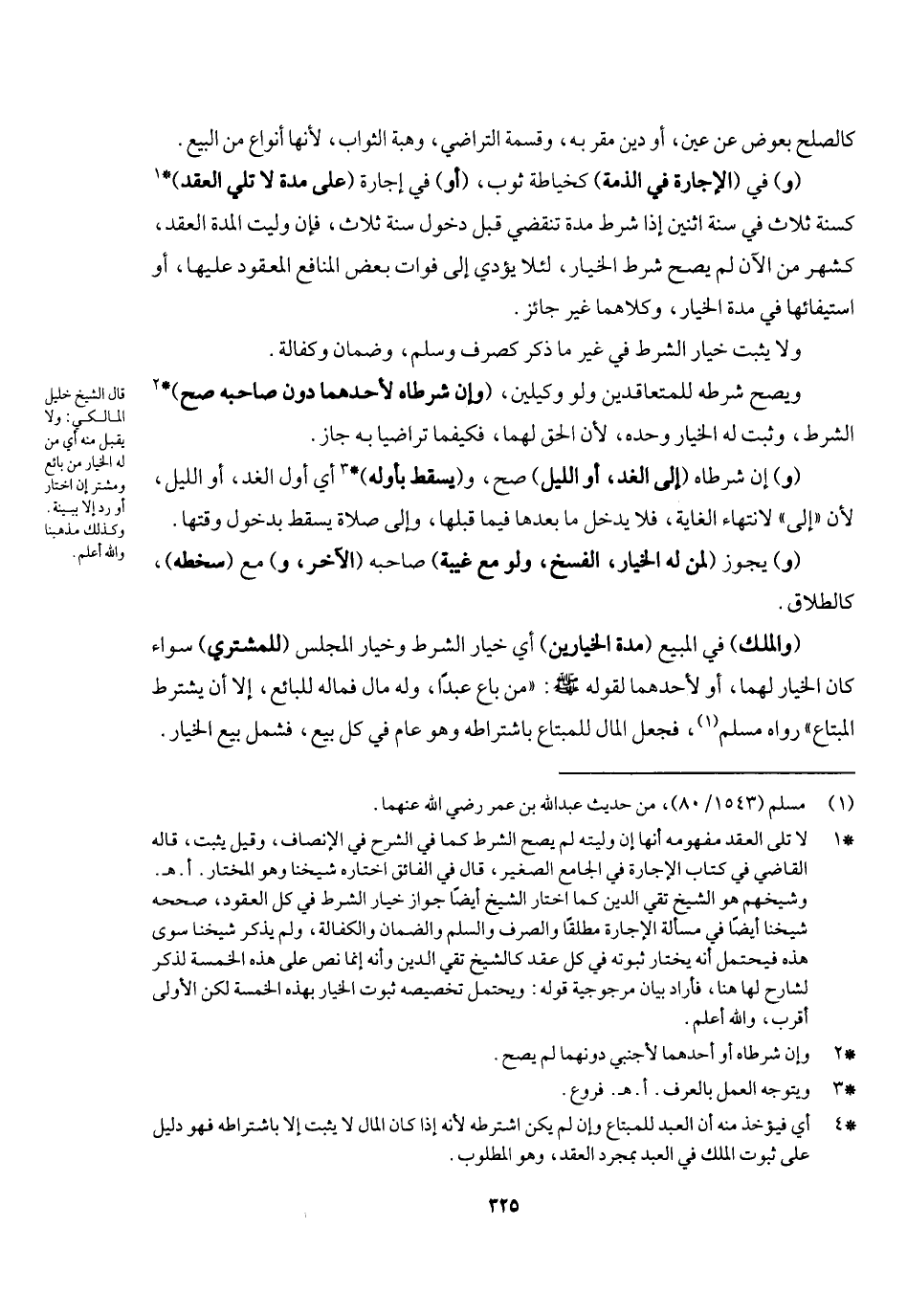 البيع (و) في (الإجارة في الذمة) كخياطة ثوب (أو) في إجارة (على مدة لا تلي العقد) كسنة ثلاث في سنة اثنين إذا شرط مدة تنقضي قبل دخول سنة ثلاث، فإن وليت مدة العقد كشهر من الآن لم يصح شرط الخيار لئلا يؤدي إلى فوات بعض المنافع المعقود عليها أو استيفائها في مدة الخيار وكلاهما غير جائز، ولا يثبت خيار الشرط في غير ما ذكر كصرف وسلم وضمان وكفالة، ويصح شرطه للمتعاقدين ولو وكيلين، (وإن شرطاه لأحدهما دون صاحبه صح) الشرط وثبت له الخيار وحده لأن الحق لهما فكيفما تراضيا به جاز، (و) إن شرطاه (إلى الغد أو الليل) صح و (يسقط بأوله) أي أول الغد أو الليل؛ لأن " إلى " لانتهاء الغاية فلا يدخل ما بعدها فيما قبلها وإلى الصلاة يسقط بدخول وقتها، (و) يجوز لمن له الخيار الفسخ ولو مع غيبة) صاحبه (الآخر) ومع (سخطه) كالطلاق (والملك) في المبيع (مدة الخيارين) أي خيار الشرط وخيار المجلس (للمشتري) سواء كان الخيار لهما أو لأحدهما لقوله - صَلَّى اللَّهُ عَلَيْهِ وَسَلَّمَ -: «من باع عبدا وله مال فماله للبائع إلا أن يشترط المبتاع» رواه مسلم، فجعل المال للمبتاع باشتراطه وهو عام في كل بيع فشمل بيع الخيار