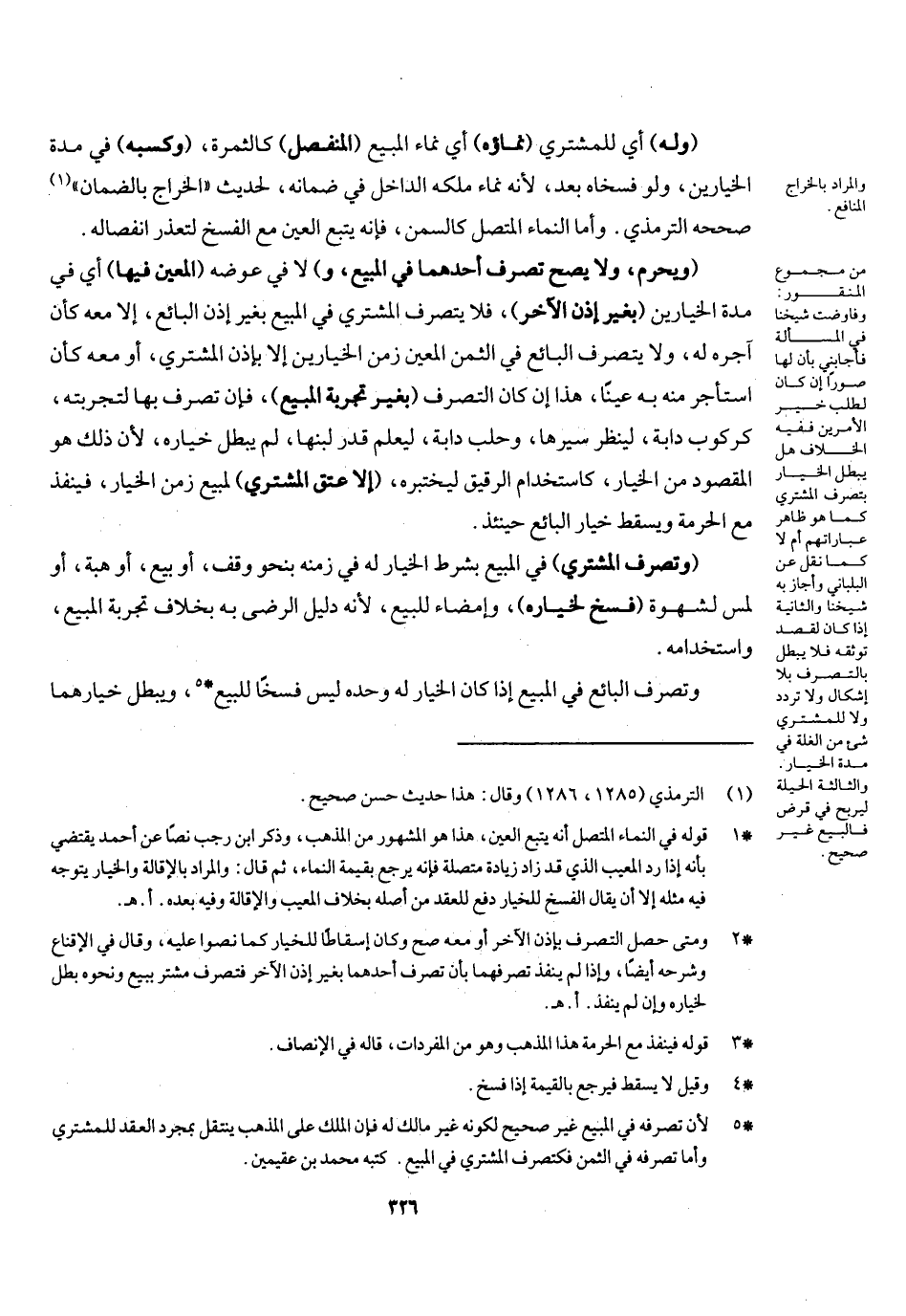 (وله) أي للمشتري نماؤه) أي نماء المبيع المنفصل) كالثمرة، وكسبه) في مدة الخيارين ولو فسخاه بعد؛ لأنه نماء ملكه الداخل في ضمانه لحديث «الخراج بالضمان» صححه الترمذي، وأما النماء المتصل كالسمن فإنه يتبع العين مع الفسخ لتعذر انفصاله.