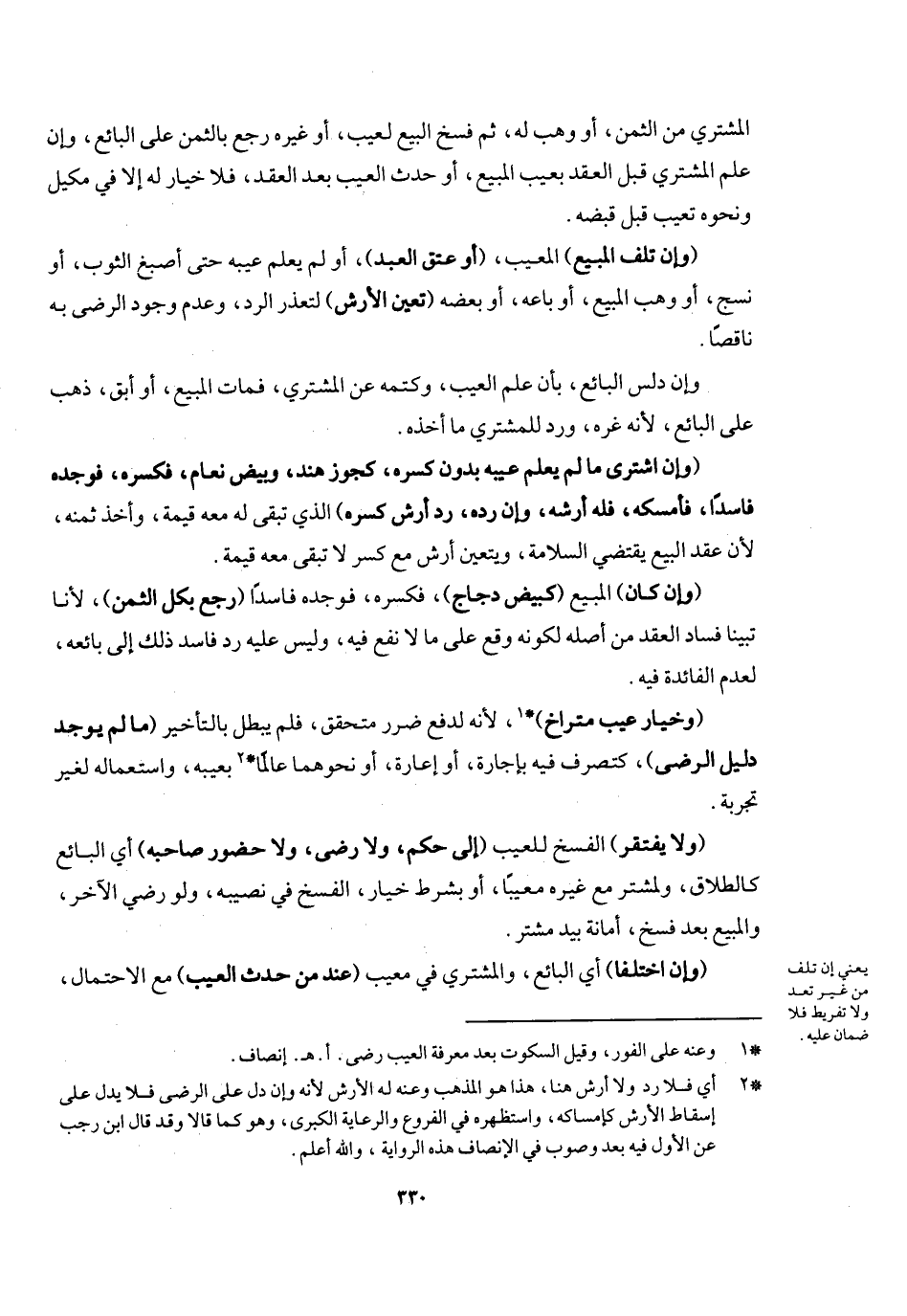 (ولا يفتقر) الفسخ للعيب إلى حكم ولا رضا ولا حضور صاحبه) أي البائع كالطلاق، ولمشتر مع غيره معيبا أو بشرط خيار الفسخ في نصيبه ولو رضي الآخر، والمبيع بعد فسخ أمانة بيد مشتر، (وإن اختلفا) أي البائع والمشتري في معيب عند من حدث العيب) مع الاحتمال