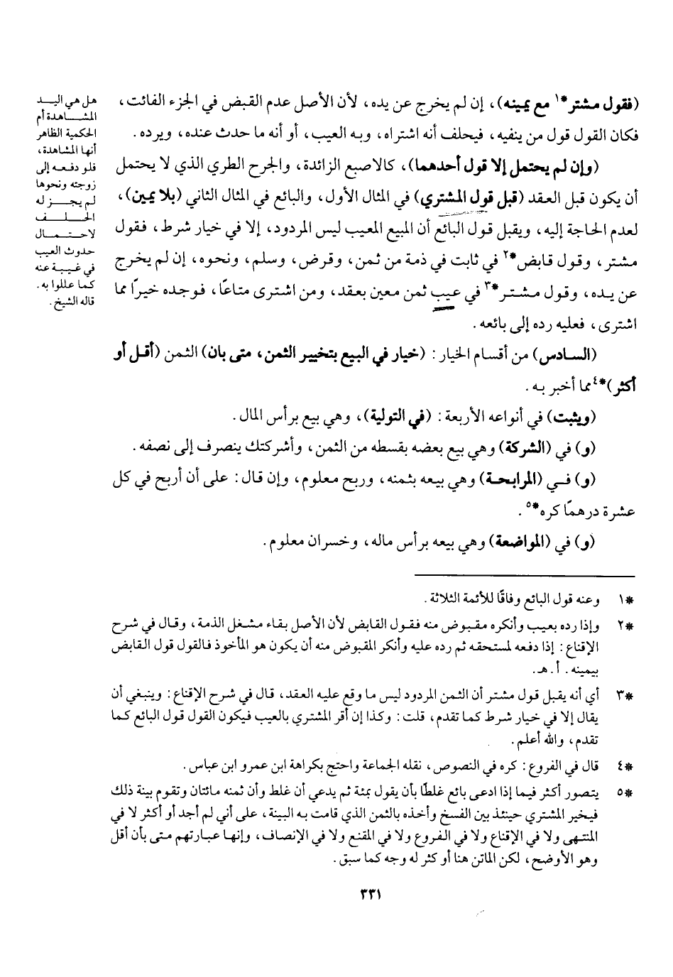 (السادس) من أقسام الخيار: خيار في البيع بتخيير الثمن متى بان) الثمن (أقل أو أكثر) مما أخبره به، (ويثبت) في أنواعه الأربعة (في التولية) وهو بيع برأس المال، (و) في (الشركة) وهي بيع بعضه بقسطه من الثمن وأشركتك ينصرف إلى نصفه، (و) في (المرابحة) وهي بيع بثمنه وربح معلوم، وإن قال: على أن أربح في كل عشرة درهما كره، (و) في (المواضعة) وهي بيعه برأس ماله وخسران معلوم،