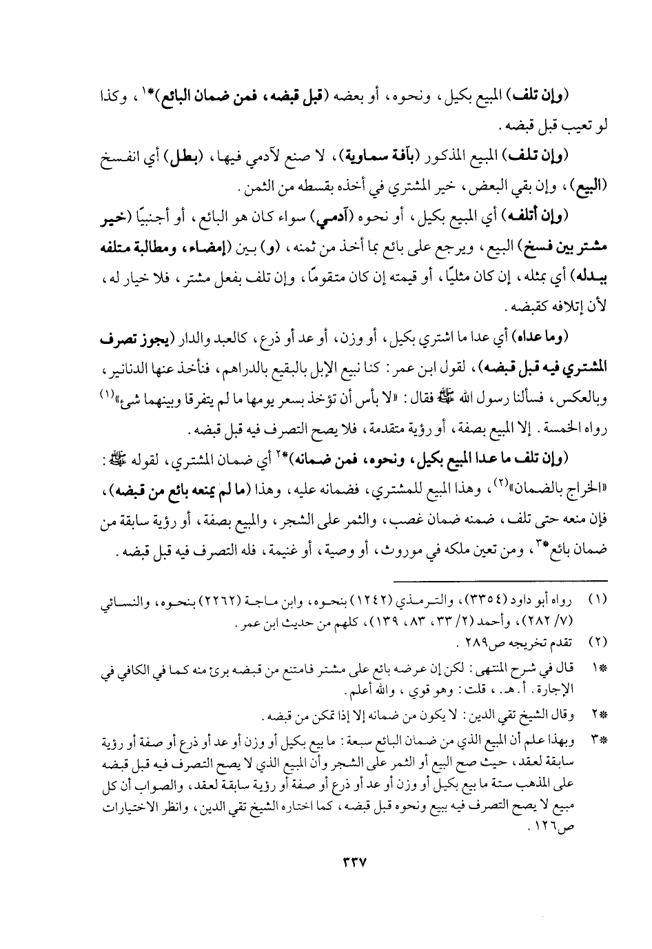 (وإن أتلفه) أي المبيع بكيل أو نحوه (آدمي) سواء كان هو البائع أو أجنبيا (خير مشتر بين فسخ) البيع ويرجع على بائع بما أخذ من ثمنه (و) بين (إمضاء ومطالبة متلفه ببدله) أي بمثله إن كان مثليا أو قيمته إن كان متقوما، وإن تلف بفعل مشتر فلا خيار له لأن إتلافه كقبضه (وما عداه) أي عدا ما اشترى بكيل أو وزن أو عد أو ذرع كالعبد والدار و (يجوز تصرف المشتري فيه قبل قبضه) لقول ابن عمر: «كنا نبيع الإبل بالبقيع بالدراهم فنأخذ عنها الدنانير وبالعكس، فسألنا رسول الله - صَلَّى اللَّهُ عَلَيْهِ وَسَلَّمَ - فقال: " لا بأس أن تؤخذ بسعر يومها ما لم يفترقا وبينهما شيء» رواه الخمسة، إلا المبيع بصفة أو رؤية متقدمة فلا يصح التصرف فيه قبل قبضه (وإن تلف ما عدا المبيع بكيل ونحوه فمن ضمانه) أي ضمان المشتري لقوله - صَلَّى اللَّهُ عَلَيْهِ وَسَلَّمَ -: «الخراج بالضمان» ، وهذا المبيع للمشتري فضمانه عليه وهذا (ما لم يمنعه بائع من قبضه) فإن منعه حتى تلف ضمنه ضمان غصب والثمر على الشجر والمبيع بصفة أو رؤية سابقة من ضمان بائع، ومن تعين ملكه في موروث أو وصية أو غنيمة فله التصرف فيه قبل قبضه.