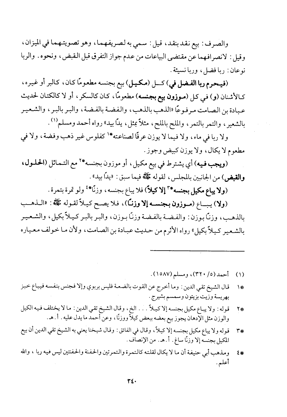 (فيحرم ربا الفضل في) كل (مكيل) بيع بجنسه مطعوما كان كالبر أو غيره كالأشنان (و) في كل (موزون بيع بجنسه) مطعوما كان كالسكر أو لا كالكتان لحديث عبادة بن الصامت مرفوعا «الذهب بالذهب والفضة بالفضة والبر بالبر والشعير بالعشير والتمر بالتمر والملح بالملح مثلا بمثل يدا بيد» رواه أحمد ومسلم، ولا ربا في ماء ولا فيما لا يوزن عرفا لصناعة كفلوس غير ذهب وفضة، ولا في مطعوم لا يكال ولا يوزن كبيض وجوز.