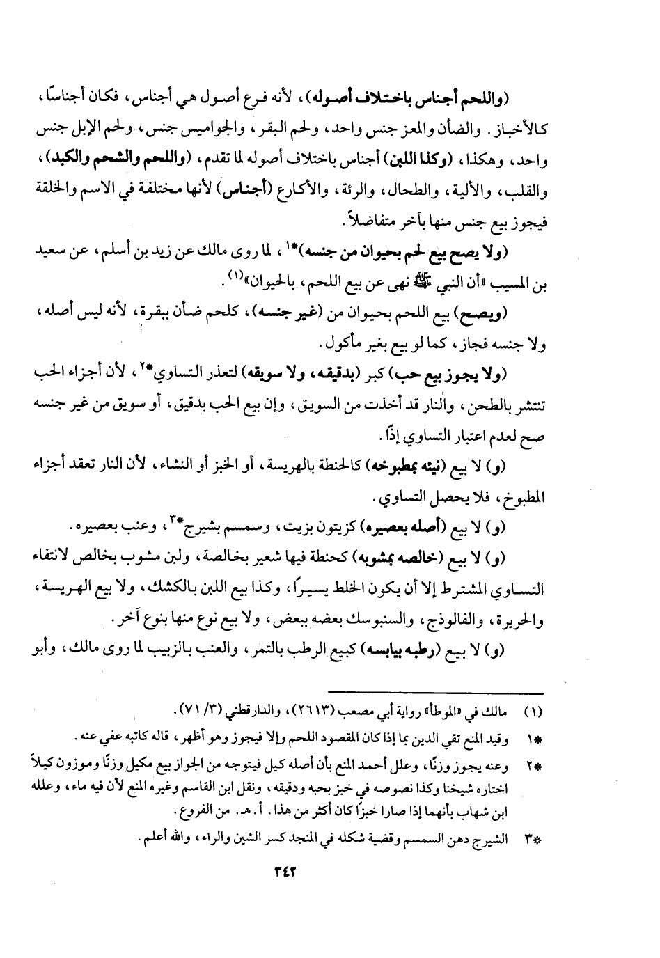 النار تعقد أجزاء المطبوخ فلا يحصل التساوي، (و) لا بيع (أصله بعصيره) كزيتون بزيت وسمسم بشيرج وعنب بعصيره، (و) لا بيع (خالصه بمشوبه) كحنطة فيها شعير بخالصة ولبن مشوب بخالص؛ لانتفاء التساوي المشترط إلا أن يكون الخلط يسيرا، وكذا بيع اللبن بالكشك، ولا بيع الهريسة والحريرة والفالوذج والسنبوسك بعضه ببعض، ولا بيع نوع منها بنوع آخر، (و) ولا بيع (رطبه بيابسه) كبيع الرطب بالتمر والعنب بالزبيب لما روى مالك وأبو