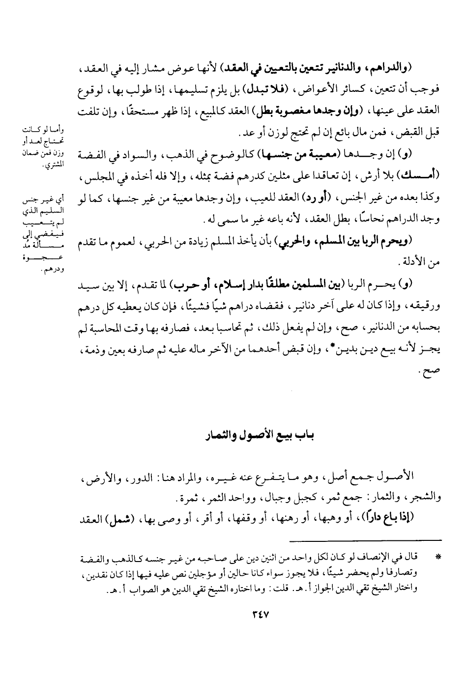 (والدراهم والدنانير تتعين بالتعيين في العقد) لأنها عوض مشار إليه في العقد فوجب أن تتعين كسائر الأعواض (فلا تبدل) بل يلزمه تسليمها إذا طولب بها لوقوع العقد على عينها، (وإن وجدها مغصوبة بطل) العقد كالمبيع إذا ظهر مستحقا وإن تلفت قبل القبض فمن مال بائع إن لم تحتج لوزن أو عد، (و) إن وجدها (معيبة من جنسها) كالوضوح في الذهب والسواد في الفضة (أمسك) بلا أرش إن تعاقدا على مثلين كدرهم فضة بمثله وإلا فله أخذه في المجلس، وكذا بعده من غير الجنس، (أورد) العقد للعيب وإن وجدها معيبة من غير جنسها كما لو وجد الدراهم نحاسا بطل العقد؛ لأنه باعه غير ما سمى له.