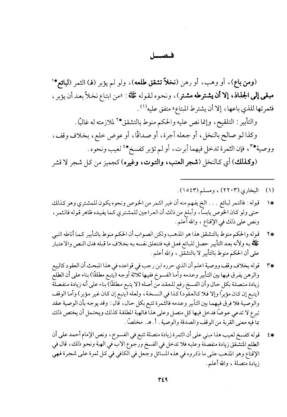 فصل (ومن باع) أو وهب أو رهن نخلا تشقق طلعه) ولو لم يؤبر (فـ) الثمر (لبائع مبقى إلى الجذاذ إلا أن يشترطه مشتر) ونحوه لقوله - صَلَّى اللَّهُ عَلَيْهِ وَسَلَّمَ - «من ابتاع نخلا بعد أن تؤبر فثمرتها للذي باعها إلا أن يشترطه المبتاع» متفق عليه، والتأبير: التلقيح، وإنما نص عليه والحكم منوط بالتشقق لملازمته له غالبا، وكذا لو صالح بالنخل أو جعله أجرة أو صداقا أو عوض خلع بخلاف وقف ووصية فإن الثمرة تدخل فيهما أبرت أو لم تؤبر كفسخ لعيب ونحوه، (وكذلك) أي كالنخل (شجر العنب والتوت والرمان وغيره) كجميز من كل شجر لا قشر