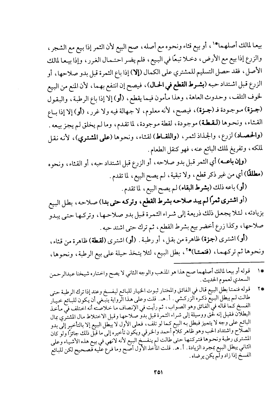 (وإن باعه) أي: الثمر قبل بدو صلاحه، أو الزرع قبل اشتداد حبه أو القثاء ونحوه (مطلقا) أي: من غير ذكر قطع ولا تبقية لم يصح البيع؛ لما تقدم (أو) باعه ذلك (بشرط البقاء) لم يصح البيع؛ لما تقدم (أو اشترى ثمرا لم يبد صلاحه بشرط القطع وتركه حتى بدا) صلاحه، بطل البيع بزيادته؛ لئلا يجعل ذلك ذريعة إلى شراء الثمرة قبل بدو صلاحها وتركها حتى يبدو صلاحها، وكذا زرع أخضر بيع بشرط القطع، ثم ترك حتى اشتد حبه (أو) اشترى (جزة) ظاهرة من بقل أو رطبة، (أو) اشترى (لقطة) ظاهرة من قثاء ونحوها ثم تركهما (فنمتا) بطل البيع؛ لئلا يتخذ حيلة على بيع الرطبة ونحوها