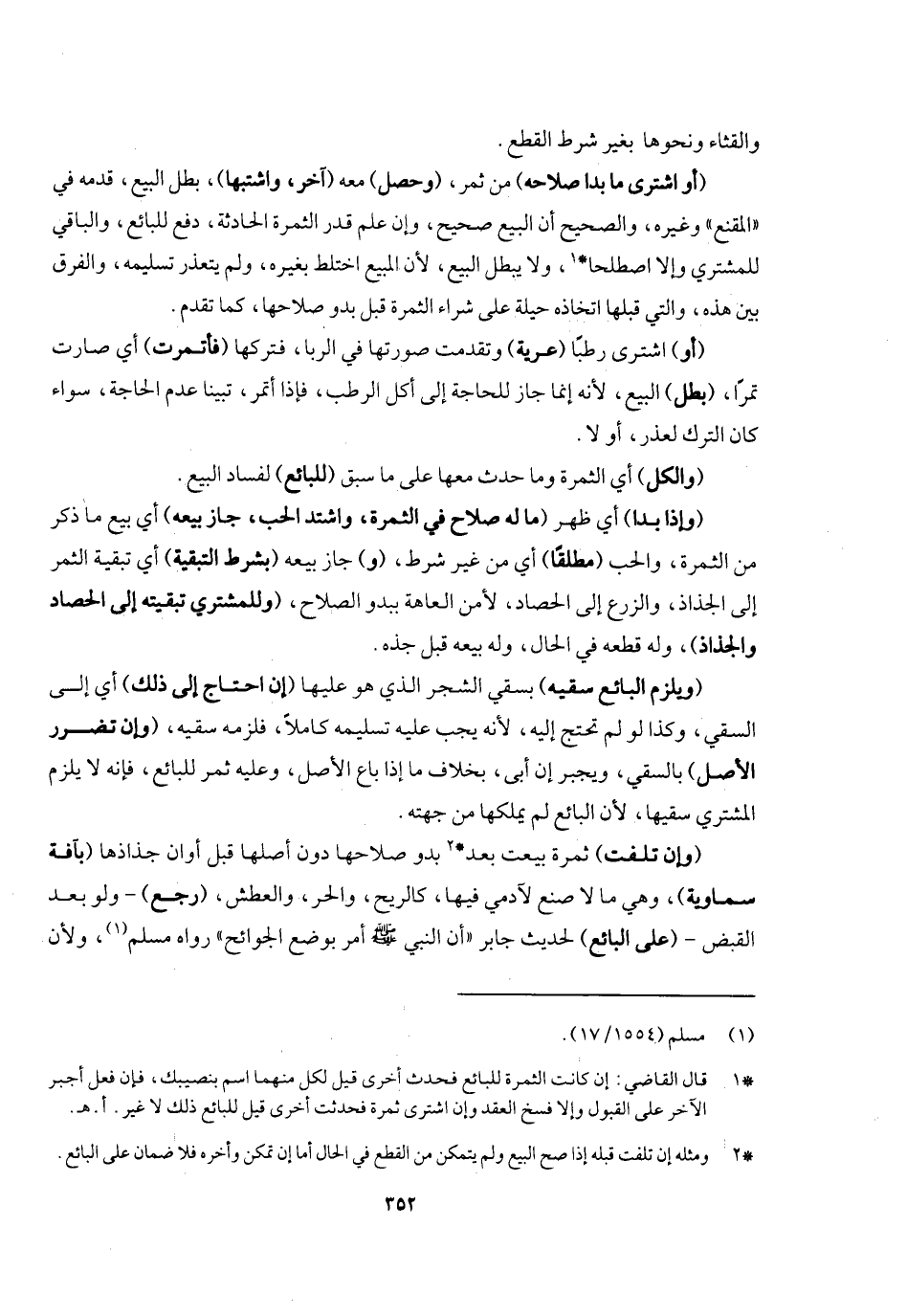 (وإذا بدا) أي: ظهر (ما له صلاح في الثمرة واشتد الحب جاز بيعه) أي: بيع ما ذكر من الثمرة والحب، (مطلقا) أي: من غير شرط (و) جاز بيعه (بشرط التبقية) أي: تبقية الثمر إلى الجذاذ والزرع إلى الحصاد؛ لأمن العاهة ببدو الصلاح (وللمشتري تبقيته إلى الحصاد والجذاذ) وله قطعه في الحال، وله بيعه قبل جذه، (ويلزم البائع سقيه) بسقي الشجر الذي هو عليها (إن احتاج إلى ذلك) أي: إلى السقي، وكذا لو لم تحتج إليه؛ لأنه يجب عليه تسليمه