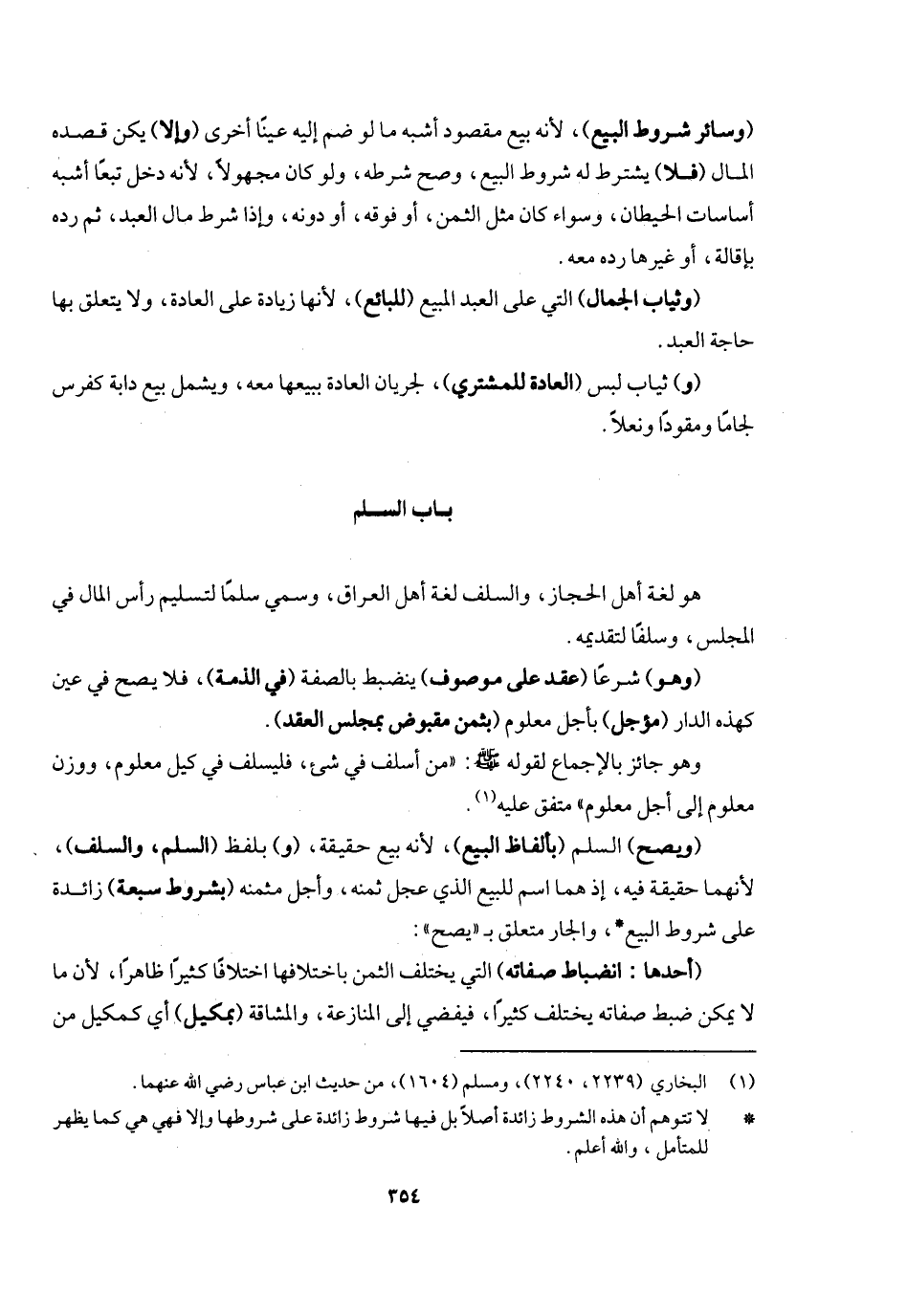 هو لغة أهل الحجاز، والسلف لغة أهل العراق، وسمي سلما لتسليم رأس المال في المجلس وسلفا لتقديمه، (وهو) شرعا (عقد على موصوف) ينضبط بالصفة (في الذمة) فلا يصح في عين كهذه الدار (مؤجل) بأجل معلوم (بثمن مقبوض بمجلس العقد) وهو جائز بالإجماع؛ لقوله - صَلَّى اللَّهُ عَلَيْهِ وَسَلَّمَ -: «من أسلف في شيء فليسلف في كيل معلوم ووزن معلوم إلى أجل معلوم» متفق عليه.