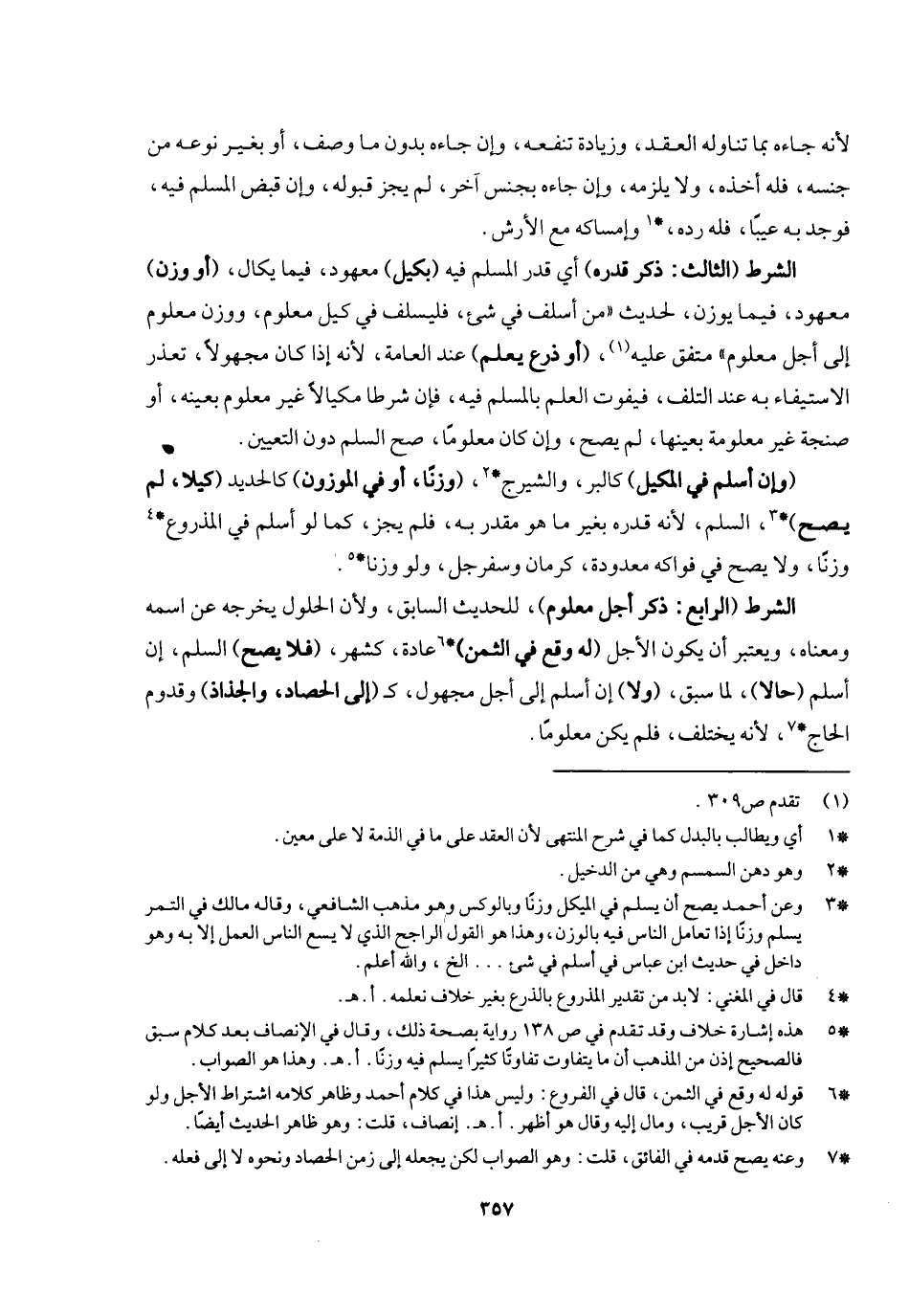 الشرط (الثالث: ذكر قدره) أي: قدر المسلم فيه (بكيل) معهود فيما يكال (أو وزن) معهود فيما يوزن لحديث «من أسلف في شيء فليسلف في كيل معلوم ووزن معلوم إلى أجل معلوم» متفق عليه، (أو ذرع يعلم) عند العامة؛ لأنه إذا كان مجهولا تعذر الاستيفاء به عند التلف، فيفوت العلم بالمسلم فيه، فإن شرطا مكيالا غير معلوم بعينه أو صنجة غير معلومة بعينها لم يصح، وإن كان معلوما صح السلم دون التعيين، (وإن أسلم في المكيل)