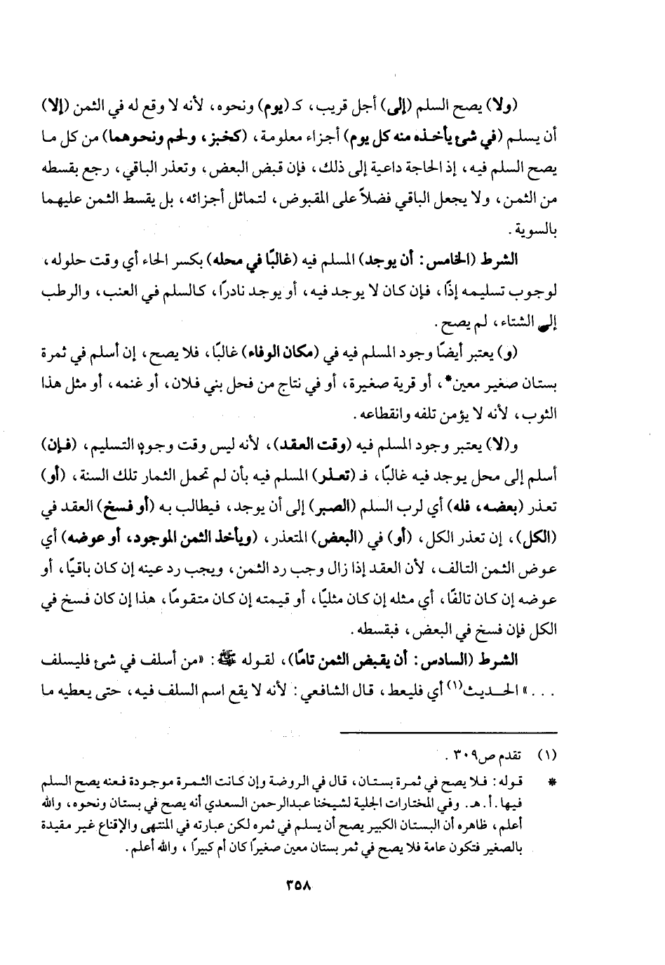 الشرط (الخامس: أن يوجد) المسلم فيه (غالبا في محله) بكسر الحاء أي: وقت حلوله لوجوب تسليمه إذا، فإن كان لا يوجد فيه أو يوجد نادرا كالسلم في العنب والرطب إلى الشتاء لم يصح، (و) يعتبر أيضا وجود المسلم فيه في (مكان الوفاء) غالبا، فلا يصح أن أسلم في ثمرة بستان صغير معين أو قرية صغيرة، أو في نتاج من فحل بني فلان أو غنمه، أو مثل هذا الثوب؛ لأنه لا يؤمن تلفه وانقطاعه، و (لا) يعتبر وجود المسلم فيه (وقت العقد) لأنه ليس وقت وجوب التسليم، (فإن) أسلم إلى محل يوجد فيه غالبا، فـ (تعذر) المسلم فيه بأن لم تحمل الثمار تلك السنة (أو) تعذر (بعضه فله) أي: لرب السلم (الصبر) إلى أن يوجد فيطالب به (أو فسخ) العقد في (الكل) إن تعذر الكل، (أو) في (البعض) المتعذر، (ويأخذ الثمن الموجود أو عوضه) أي: عوض الثمن التالف؛ لأن العقد إذا زال وجب رد الثمن، ويجب رد عينه إن كان باقيا أو عوضه إن كان تالفا، أي: مثله إن كان مثليا، أو قيمته إن كان متقوما، هذا إن فسخ في الكل، فإن فسخ في البعض فبقسطه.