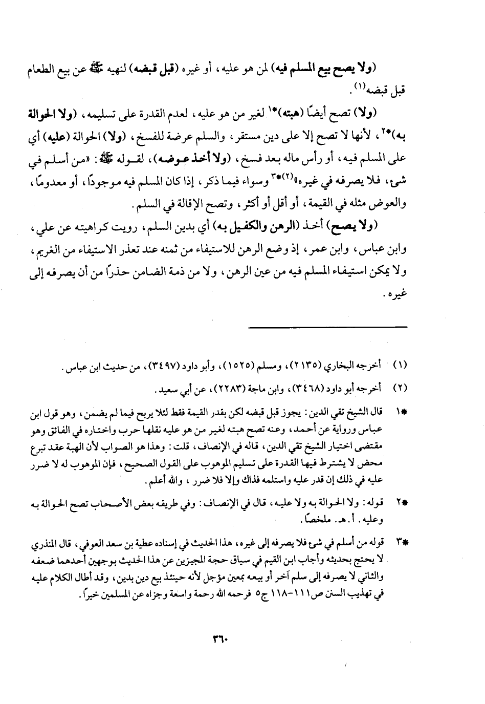 (ولا يصح بيع المسلم فيه) لمن هو عليه أو غيره (قبل قبضه) لنهيه - صَلَّى اللَّهُ عَلَيْهِ وَسَلَّمَ - عن بيع الطعام قبل قبضه، (ولا) يصح أيضا (هبته) لغير من هو عليه؛ لعدم القدرة على تسليمه (ولا الحوالة به) لأنها لا تصح إلا على دين مستقر، والسلم عرضة للفسخ، (ولا) الحوالة (عليه) أي: على المسلم فيه أو رأس ماله بعد فسخ، (ولا أخذ عوضه) لقوله - صَلَّى اللَّهُ عَلَيْهِ وَسَلَّمَ -: «من أسلف في شيء فلا يصرفه إلى غيره» وسواء