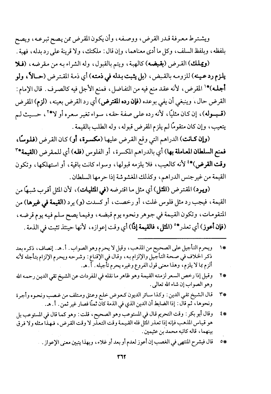 القرض بعينه (لزم) المقرض (قبوله) إن كان مثليا؛ لأنه رده على صفة حقه، سواء تغير سعره أو لا حيث لم يتعيب، وإن كان متقوما لم يلزم المقرض قبوله، وله الطلب بالقيمة، (وإن كانت) الدراهم التي وقع القرض عليها (مكسرة أو) كان القرض (فلوسا فمنع السلطان المعاملة بها) أي: بالدراهم المكسرة أو الفلوس (فله) أي: للمقرض (القيمة وقت القرض) لأنه كالعيب، فلا يلزمه قبولها، وسواء كانت باقية أو استهلكها، وتكون القيمة من غير جنس الدراهم، وكذلك المغشوشة إذا حرمها السلطان، (ويرد) المقترض (المثل) أي: مثل ما اقترضه (في المثليات) لأن المثل أقرب شبها من القيمة، فيجب رد مثل فلوس غلت أو رخصت أو كسدت (و) يرد (القيمة في غيرها) من المتقومات، وتكون القيمة في جوهر ونحوه يوم قبضه وفيما يصح سلم فيه يوم قرضه، (فإن أعوز) أي: تعذر (المثل فالقيمة إذا) أي: وقت إعوازه؛ لأنها حينئذ تثبت في الذمة.