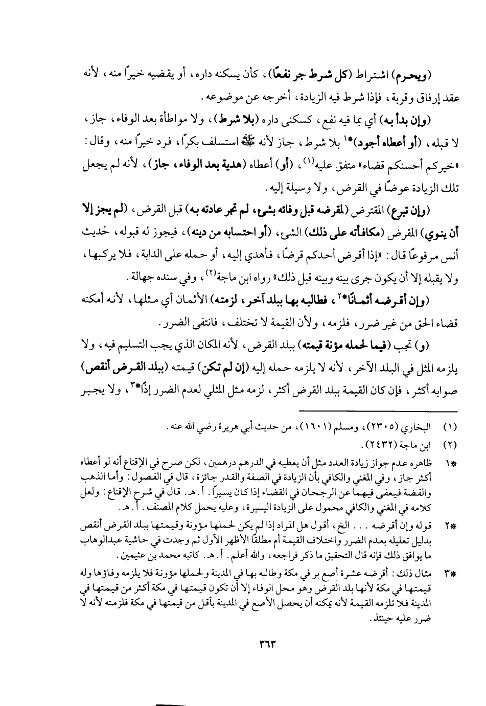 (ويحرم) اشتراط (كل شرط جر نفعا) كأن يسكنه داره أو يقضيه خيرا منه؛ لأنه عقد إرفاق وقربة، فإذا شرط فيه الزيادة أخرجه عن موضوعه، (وإن بدأ به) أي: بما فيه نفع كسكنى داره (بلا شرط) ولا مواطأة بعد الوفاء جاز لا قبله، (أو أعطاه أجود) بلا شرط جاز؛ لأنه - صَلَّى اللَّهُ عَلَيْهِ وَسَلَّمَ - استسلف بكرا فرد خيرا منه وقال: «خيركم أحسنكم قضاء» متفق عليه، (أو) أعطاه (هدية بعد الوفاء جاز) لأنه لم يجعل تلك الزيادة عوضا في القرض ولا وسيلة إليه، (وإن تبرع) المقترض (لمقرضه قبل وفائه بشيء لم تجر عادته به) قبل القرض (لم يجز إلا أن ينوي) المقرض (مكافأته) على ذلك الشيء (أو احتسابه من دينه) فيجوز له قبوله؛ لحديث أنس مرفوعا قال: «إذا أقرض أحدكم قرضا فأهدي إليه أو حمله على الدابة، فلا يركبها ولا يقبله إلا أن يكون جرى بينه وبينه قبل ذلك» رواه ابن ماجه وفي سنده جهالة.