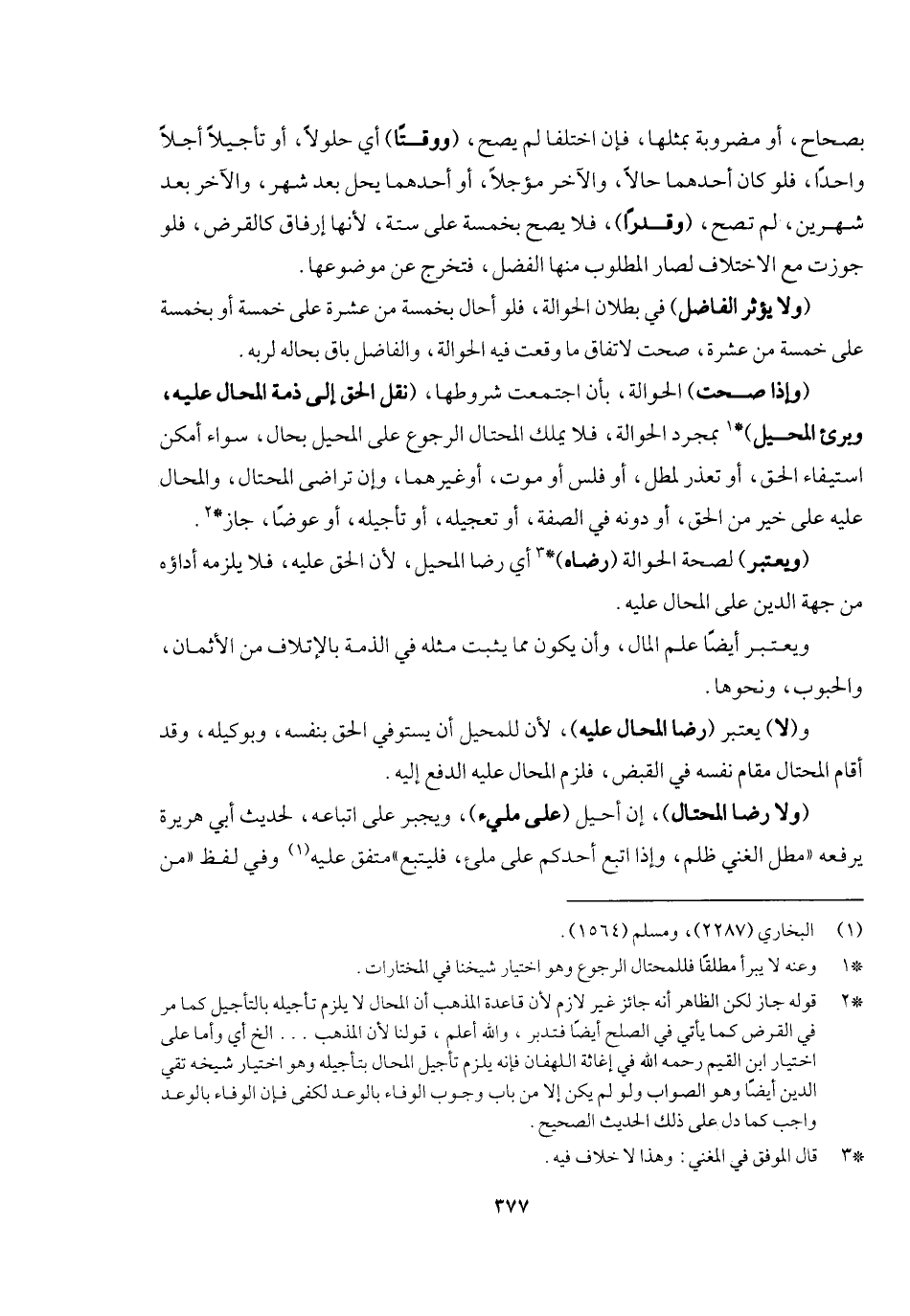(وإذا صحت) الحوالة بأن اجتمعت شروطها (نقل الحق إلى ذمة المحال عليه وبرئ المحيل) بمجرد الحوالة، فلا يملك المحتال الرجوع على المحيل بحال، سواء أمكن استيفاء الحق أو تعذر؛ لمطل أو فلس أو موت أو غيرها، وإن تراضى المحتال والمحال عليه على خير من الحق أو دونه في الصفة أو تعجيله أو تأجيله أو عوضه، جاز. (ويعتبر) لصحة الحوالة (رضاه) أي: رضا المحيل؛ لأن الحق عليه، فلا يلزمه أداؤه من جهة الدين على المحال عليه. ويعتبر أيضا علم المال، وأن يكون مما يثبت مثله في الذمة بالإتلاف من الأثمان والحبوب ونحوها. و (لا) يعتبر (رضا المحال عليه) لأن للمحيل أن يستوفي الحق بنفسه وبوكيله وقد أقام المحتال مقام نفسه في القبض، فلزم المحال عليه الدفع إليه، (ولا رضا المحتال) إن أحيل (على مليء) ويجبر على اتباعه؛ لحديث أبي هريرة يرفعه «مطل الغني ظلم، وإذا اتبع أحدكم على مليء فليتبع. متفق عليه، وفي لفظ: من