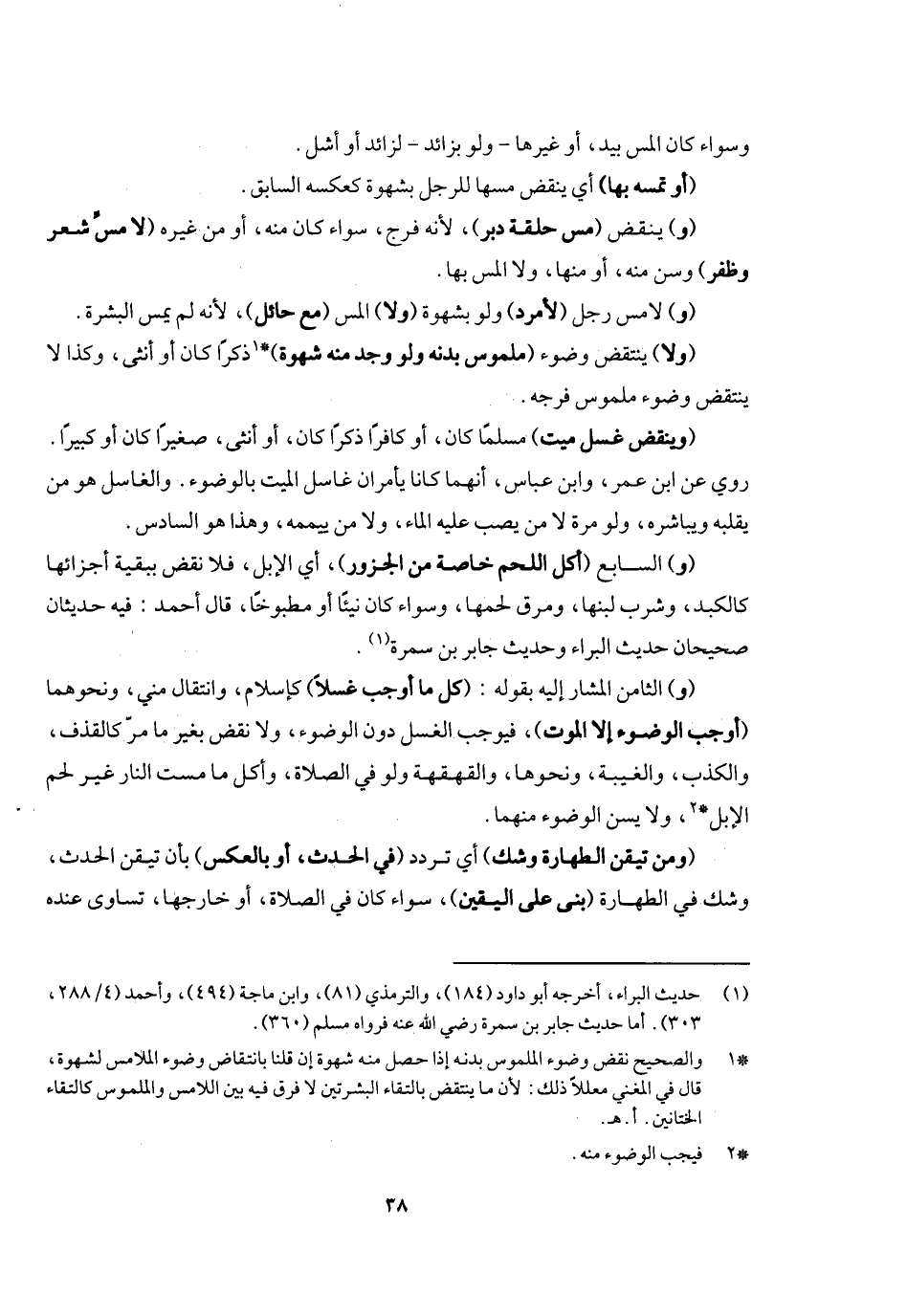 (و) الثامن المشار إليه بقوله: (كل ما أوجب غسلا) كإسلام وانتقال مني ونحوهما (أوجب الوضوء إلا الموت) فيوجب الغسل دون الوضوء، ولا نقض بغير ما مر كالقذف والكذب والغيبة ونحوها والقهقهة ولو في الصلاة، وأكل ما مست النار غير لحم الإبل ولا يسن الوضوء منهما.