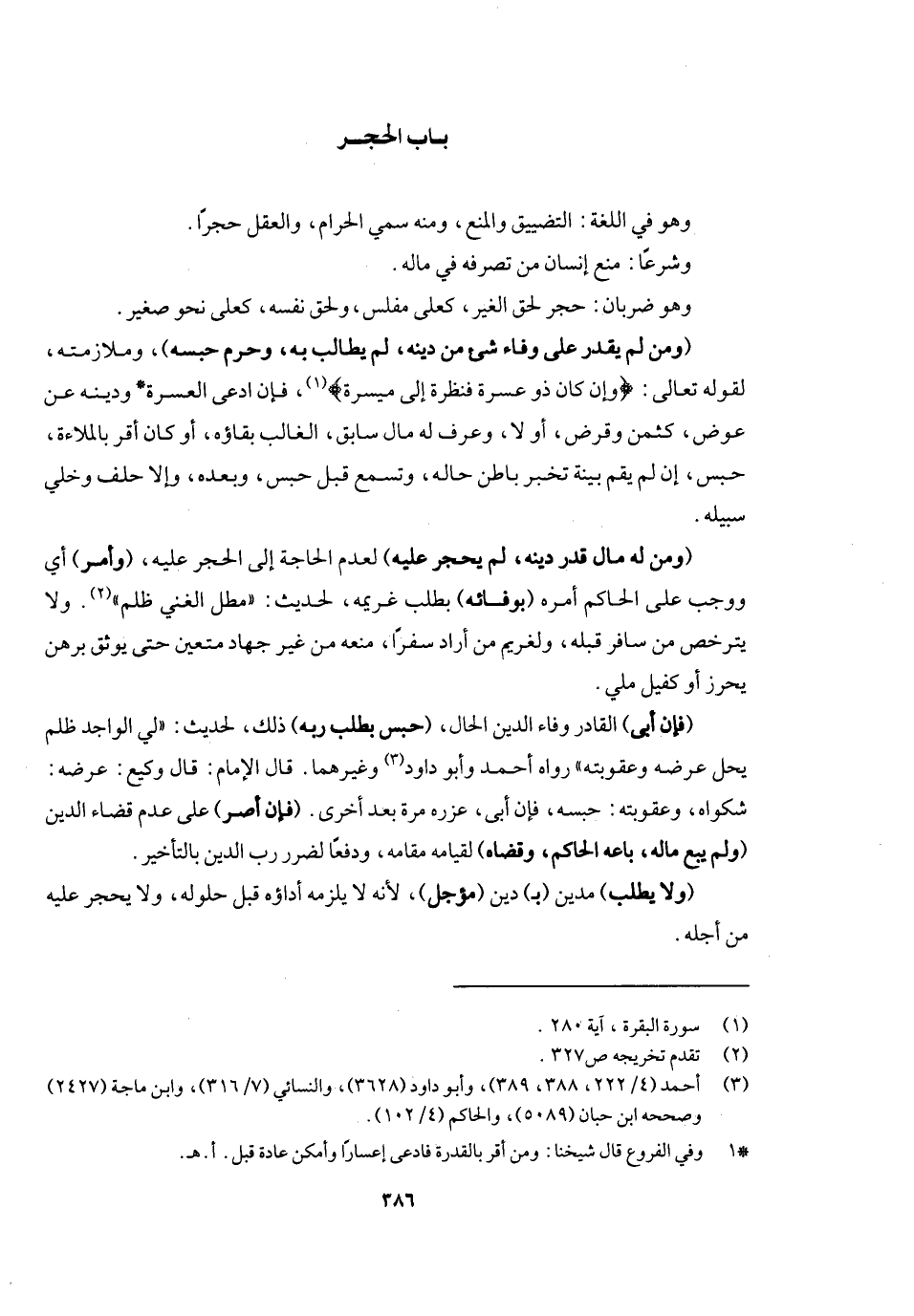 (ومن لم يقدر على وفاء شيء من دينه، لم يطالب به وحرم حبسه) وملازمته؛ لِقَوْلِهِ تَعَالَى: {وَإِنْ كَانَ ذُو عُسْرَةٍ فَنَظِرَةٌ إِلَى مَيْسَرَةٍ} [البقرة: ٢٨٠] ، فإن ادعى العسرة ودينه عن عوض كثمن وقرض أو لا، وعرف له مال سابق الغالب بقاؤه، أو كان أقر بالملاءة حبس إن لم يقم بينة تخبر باطن حاله وتسمع قبل حبس وبعده، وإلا حلف وخلي سبيله. (ومن له ماله قدر دينه لم يحجر عليه) ؛ لعدم الحاجة إلى الحجر عليه، (وأمر) أي: ووجب على الحاكم أمره (بوفائه) بطلب غريمه لحديث: «مطل الغني ظلم» . ولا يترخص من سافر قبله ولغريم من أراد سفرا منعه من غير جهاد متعين حتى يوثق برهن يحرز أو كفيل ملي. (فإن أبى) القادر وفاء الدين الحال (حبس بطلب ربه) ذلك لحديث: «لي الواجد ظلم يحل عرضه وعقوبته» رواه أحمد وأبو داود وغيرهما. قال الإمام: قال وكيع: عرضه: شكواه، وعقوبته: حبسه، فإن أبى عزره مرة بعد أخرى، (فإن أصر) على عدم قضاء الدين (ولم يبع ماله، باعه الحاكم وقضاه) لقيامه مقامه ودفعا لضرر رب الدين بالتأخير.
