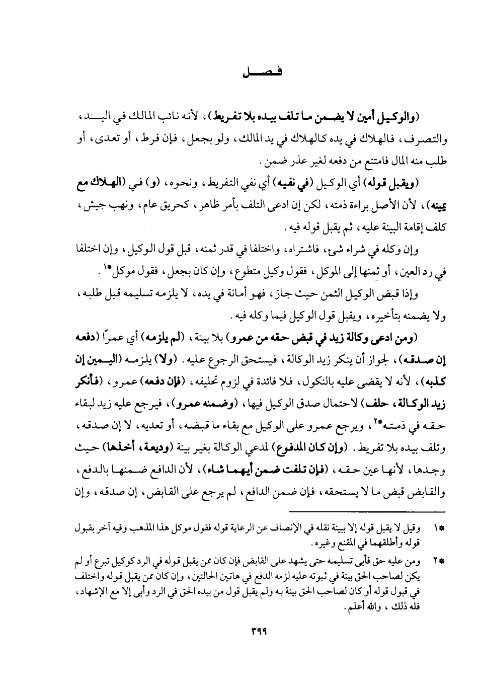 فصل (والوكيل أمين لا يضمن ما تلف بيده بلا تفريط) لأنه نائب المالك في اليد والتصرف، فالهلاك في يده كالهلاك في يد المالك ولو بجعل، فإن فرط أو تعدى أو طلب منه المال فامتنع من دفعه لغير عذر، ضمن. (ويقبل قوله) أي: الوكيل (في نفيه) أي: نفي التفريط ونحوه، (و) في (الهلاك مع يمينه) لأن الأصل براءة ذمته، لكن إن ادعى التلف بأمر ظاهر كحريق عام ونهب جيش، كلف إقامة البينة عليه، ثم يقبل قوله فيه. وإن وكله في شراء شيء فاشتراه واختلفا في قدر ثمنه قبل قول الوكيل، وإن اختلفا في رد العين أو ثمنها إلى الموكل، فقول وكيل متطوع، وإن كان بجعل فقول موكل. وإذا قبض الوكيل الثمن حيث جاز فهو أمانة في يده، لا يلزمه تسليمه قبل طلبه، ولا يضمنه بتأخيره، ويقبل قول الوكيل فيما وكل فيه.