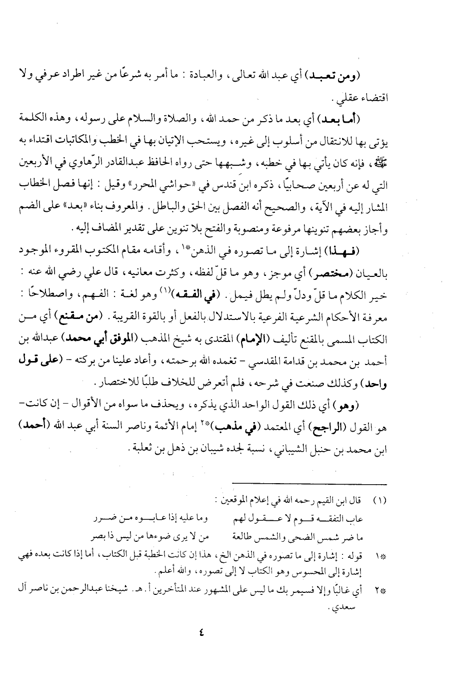 (فهذا) إشارة إلى ما تصوره في الذهن، وأقامه مقام المكتوب المقروء الموجود بالعيان (مختصر) أي موجز، وهو ما قل لفظه وكثرت معناه، قال علي - رَضِيَ اللَّهُ عَنْهُ -: خير الكلام ما قل ودل ولم يطل فيمل. (في الفقه) وهو لغة الفهم، واصطلاحا: معرفة الأحكام الشرعية الفرعية بالاستدلال بالفعل أو بالقوة القريبة. (من مقنع) أي من الكتاب المسمى بالمقنع تأليف (الإمام) المقتدى به شيخ المذهب (الموفق أبي محمد) عبد الله بن أحمد بن محمد بن قدامة المقدسي تغمده الله برحمته وأعاد علينا من بركته (على قول واحد) وكذلك صنعت في شرحه فلم أتعرض للخلاف طلبا للاختصار. (وهو) أي ذلك القول الواحد الذي يذكره ويحذف ما سواه من الأقوال إن كانت، هو القول (الراجح) أي المعتمد