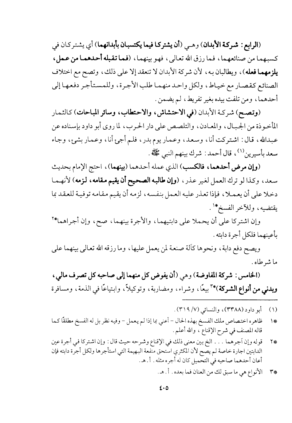 (وتصح) شركة الأبدان (في الاحتشاش والاحتطاب وسائر المباحات) كالثمار المأخوذة من الجبال والمعادن والتلصص على دار الحرب، لما روى أبو داود بإسناده «عن عبد الله قال: اشتركت أنا وسعد وعمار يوم بدر، فلم أجئ أنا وعمار بشيء، وجاء سعد بأسيرين، قال أحمد: أشرك بينهم النبي - صَلَّى اللَّهُ عَلَيْهِ وَسَلَّمَ -» . (وإن مرض أحدهما فالكسب) الذي عمله أحدهما (بينهما) احتج الإمام بحديث سعد، وكذا لو ترك العمل لغير عذر، (وإن طالبه الصحيح أن يقيم مقامه لزمه) لأنهما دخلا على أن يعملا، فإذا تعذر عليه العمل بنفسه لزمه أن يقيم مقامه توفية للعقد بما يقتضيه وللآخر الفسخ، وإن اشتركا على أن يحملا على دابتيهما والأجرة بينهما صح، وأن أجرهما بأعينهما فلكل أجرة دابته، ويصح دفع دابة ونحوها لمن يعمل عليها وما رزقه الله تعالى بينهما على ما شرطاه.