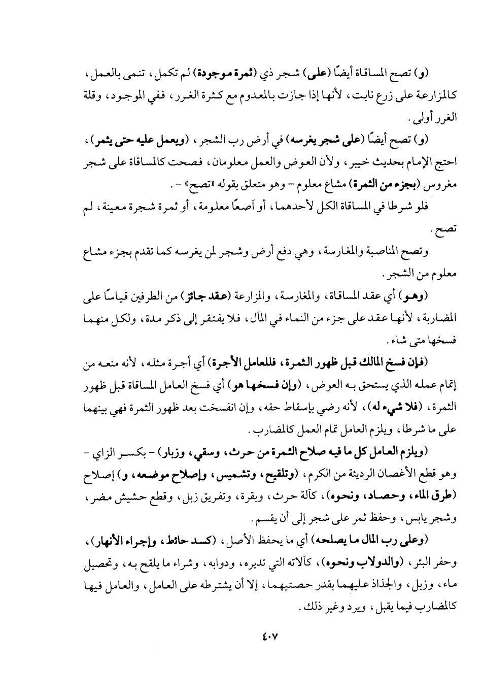 (و) تصح المساقاة أيضا (على) شجر ذي (ثمرة موجودة) لم تكمل تنمى بالعمل، كالمزارعة على زرع نابت؛ لأنها إذا جازت في المعدوم مع كثرة الغرر ففي الموجود وقلة الغرر أولى. (و) تصح أيضا (على شجر يغرسه) في أرض رب الشجر (ويعمل عليه حتى يثمر) ، احتج الإمام بحديث خيبر؛ ولأن العوض والعمل معلومان فصحت كالمساقاة على شجر مغروس (بجزء من الثمرة) مشاع معلوم، وهو متعلق بقوله: " تصح " فلو شرطا في المساقاة الكل لأحدهما أو آصعا معلومة أو ثمرة شجرة معينة، لم تصح، وتصح المناصبة والمغارسة، وهي دفع أرض وشجر لمن يغرسه كما تقدم بجزء مشاع ومعلوم من الشجر.