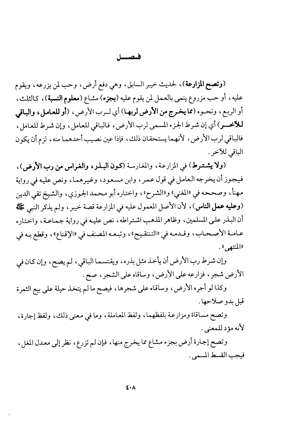 فصل (وتصح المزارعة) لحديث خيبر السابق، وهي دفع أرض وحب لمن يزرعه ويقوم عليه، أو حب مزروع ينمى بالعمل لمن يقوم عليه (بجزء) مشاع (معلوم النسبة) كالثلث أو الربع ونحوه (مما يخرج من الأرض لربها) أي: لرب الأرض، (أو للعامل والباقي للآخر) أي: أن شرط الجزء المسمى لرب الأرض فالباقي للعامل، وإن شرط للعامل فالباقي لرب الأرض؛ لأنهما يستحقان ذلك، فإذا عين نصيب أحدهما منه، لزم أن يكون الباقي للآخر.