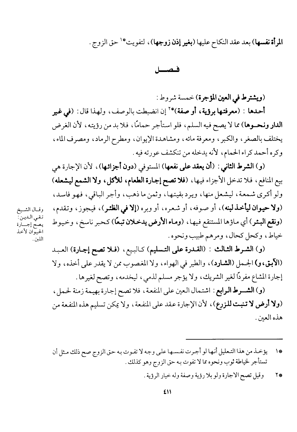 فصل (ويشترط في العين المؤجرة) خمسة شروط: