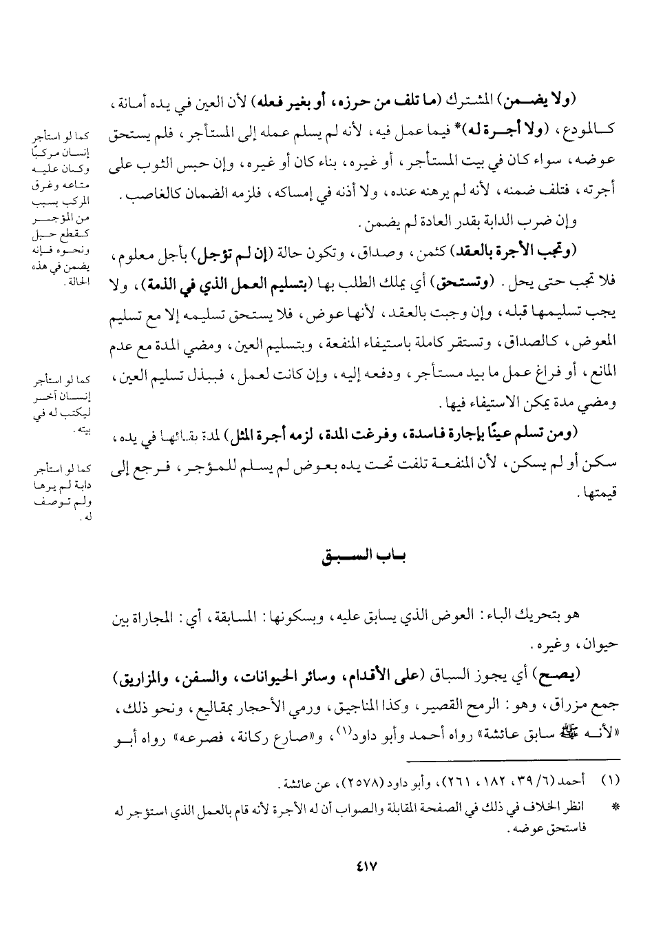 (يصح) أي: يجوز السباق (على الأقدام وسائر الحيوانات والسفن والمزاريق) جمع مزراق، وهو: الرمح القصير، وكذا المجانيق ورمي الأجحار بمقاليع ونحو ذلك؛ «لأنه - صَلَّى اللَّهُ عَلَيْهِ وَسَلَّمَ - سابق عائشة» رواه أحمد وأبو داود، " وصارع ركانة فصرعه " رواه أبو