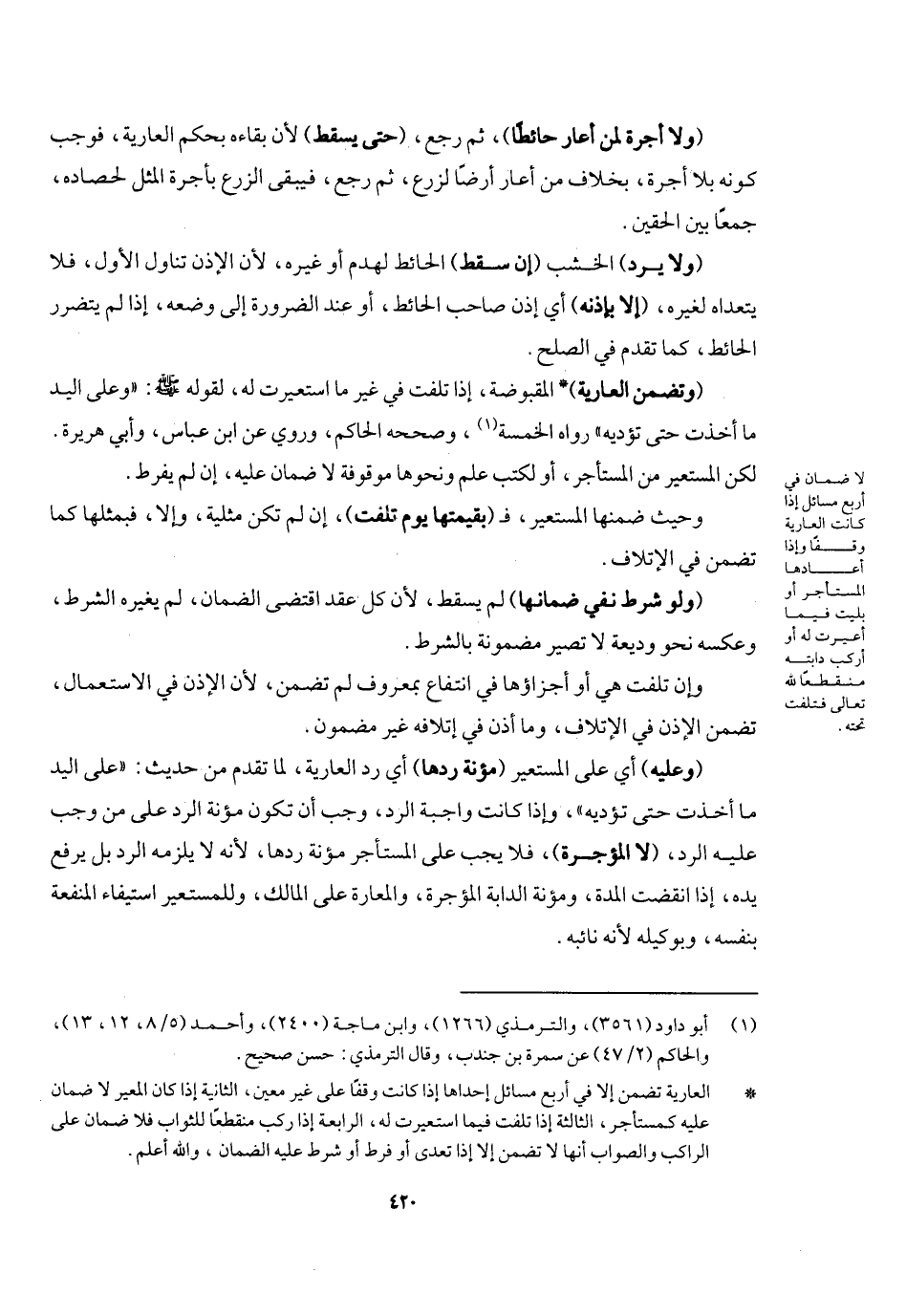 (وتضمن العارية) المقبوضة إذا تلفت في غير ما استعيرت له؛ لقوله - صَلَّى اللَّهُ عَلَيْهِ وَسَلَّمَ -: «وعلى اليد ما أخذت حتى تؤديه» رواه الخمسة وصححه الحاكم، وروي عن ابن عباس وأبي هريرة، لكن المستعير من المستأجر أو لكتب علم ونحوها موقوفة لا ضمان عليه إن لم يفرط، وحيث ضمنها المستعير فـ (بقيمتها يوم تلفت) إن لم تكن مثلية، وإلا فبمثلها كما تضمن في الإتلاف، (ولو شرط نفي ضمانها) لم يسقط؛ لأن كل عقد اقتضى الضمان لم يغيره الشرط وعكسه نحو وديعة، لا تصير مضمونة بالشرط، وإن تلفت هي أو أجزاؤها في انتفاع بمعروف لم تضمن؛ لأن الإذن في الاستعمال تضمن الإذن في الإتلاف، وما أذن في إتلافه غير مضمون، (وعليه) أي: وعلى المستعير (مؤنة ردها) أي: رد العارية، لما تقدم من حديث: «على اليد ما أخذت حتى تؤديه» ، وإذا كانت واجبة الرد وجب أن تكون مؤنة الرد على من وجب عليه الرد، (لا المؤجرة) فلا يجب على المستأجر مؤنة ردها؛ لأنه لا يلزمه الرد، بل يرفع يده إذا انقضت المدة، ومؤنة الدابة المؤجرة والمعارة على المالك، وللمستعير استيفاء المنفعة بنفسه وبوكيله؛ لأنه نائبه.