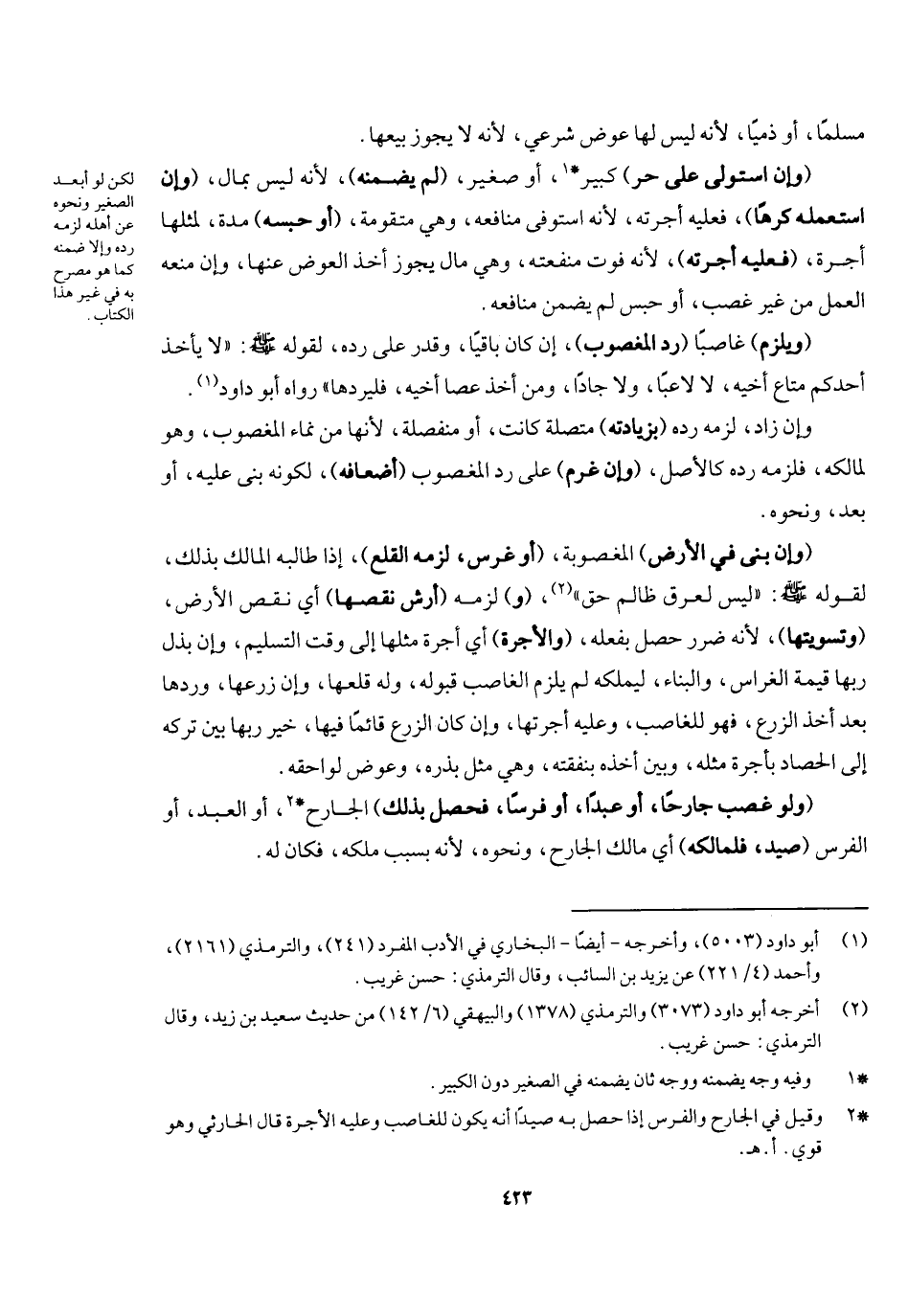 مسلما أو ذميا؛ لأنه ليس لها عوض شرعي؛ لأنه لا يجوز بيعها. (وإن استولى على حر) كبير أو صغير (لم يضمنه) ؛ لأنه ليس بمال، (وإن استعمله كرها) فعليه أجرته؛ لأنه استوفى منافعه وهي متقومة، (أو حبسه) مدة لمثلها أجرة (فعليه أجرته) ؛ لأنه فوت منفعته وهي مال يجوز أخذ العوض عنها، وإن منعه العمل من غير غصب أو حبس لم يضمن منافعه.