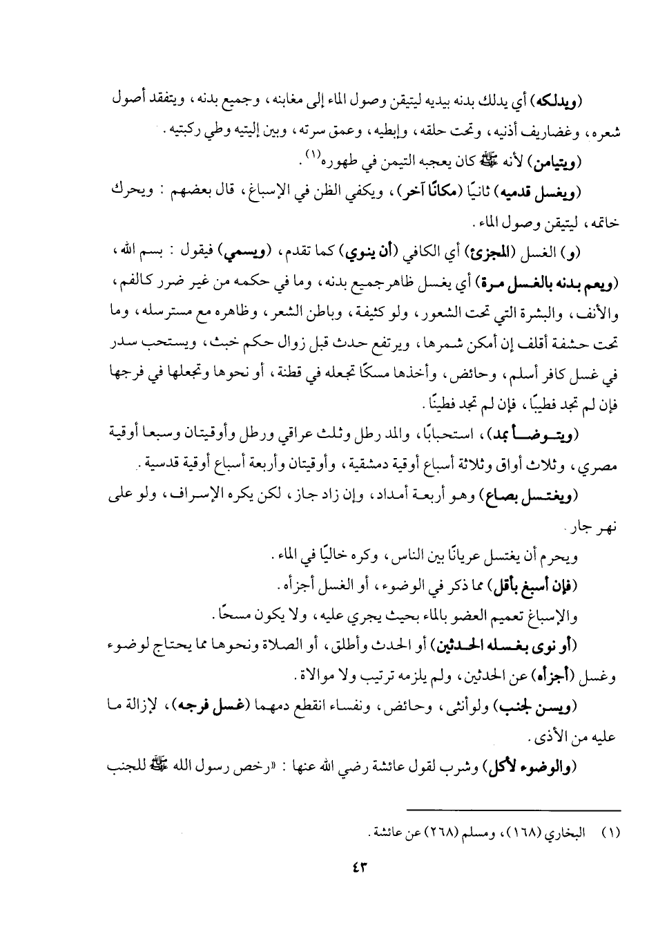 (ويسن لجنب) ولو أنثى وحائض ونفساء انقطع دمها (غسل فرجه) لإزالة ما عليه من الأذى، (والوضوء لأكل) وشرب لقول عائشة - رَضِيَ اللَّهُ عَنْهَا -: «رخص رسول الله - صَلَّى اللَّهُ عَلَيْهِ وَسَلَّمَ - للجنب