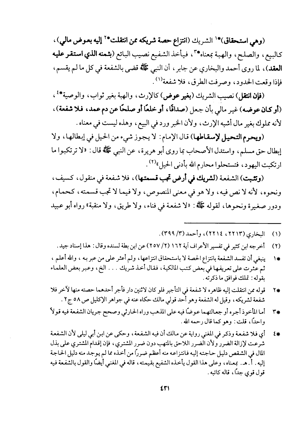 (وهي استحقاق) الشريك (انتزاع حصة شريك ممن انتقلت إليه بعوض مالي) كالبيع والصلح والهبة بمعناه، فيأخذ الشفيع نصيب البائع (بثمنه الذي استقر عليه العقد) ؛ لما روى أحمد والبخاري عن جابر «أن النبي - صَلَّى اللَّهُ عَلَيْهِ وَسَلَّمَ - قضى بالشفعة في كل ما لم يقسم» ، فإذا وقعت الحدود وصرفت الطرق فلا شفعة، (فإن انتقل) نصيب الشريك (بغير عوض) كالإرث والهبة بغير ثواب والوصية، (أو كان عوضه) غير مالي بأن جعل (صداقا أو خلعا أو صلحا عن دم عمد فلا شفعة) ؛ لأنه مملوك بغير مال أشبه الإرث؛ ولأن الخبر ورد في البيع، وهذه ليست في معناه.