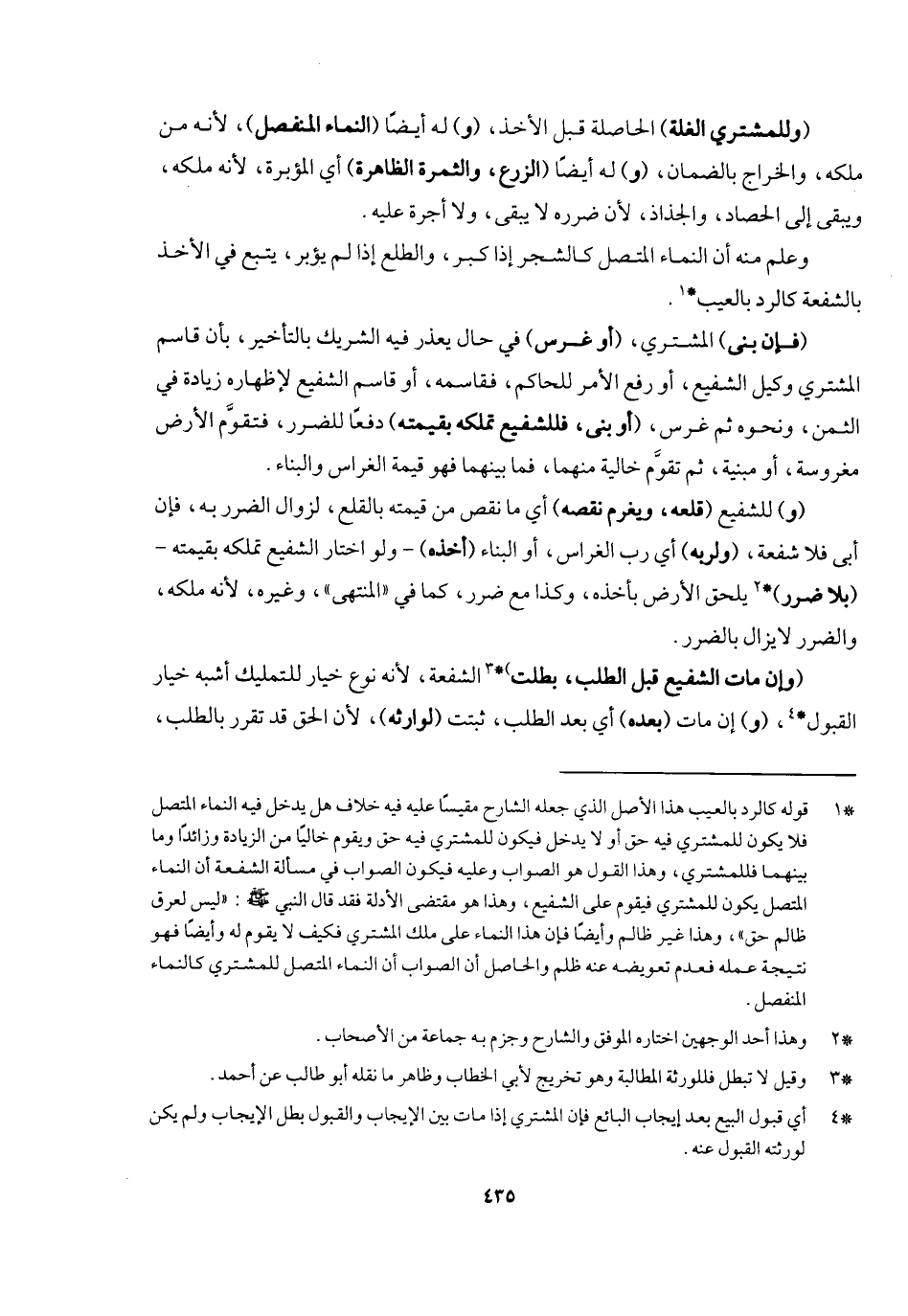 (و) للشفيع (قلعه ويغرم نقصه) أي: ما نقص من قيمته بالقلع لزوال الضرر به، فإن أبى فلا شفعة، (ولربه) أي: رب الغراس أو البناء (أخذه) ولو اختار الشفيع تملكه بقيمته (بلا ضرر) يلحق الأرض بأخذه، وكذا مع ضرر، كما في " المنتهى " وغيره؛ لأنه ملكه، والضرر لا يزال بالضرر. (وإن مات الشفيع قبل الطلب بطلت) الشفعة؛ لأنه نوع خيار للتمليك أشبه خيار القبول، (و) إن مات (بعده) أي: بعد الطلب ثبتت (لوارثه) لأن الحق قد تقرر بالطلب؛