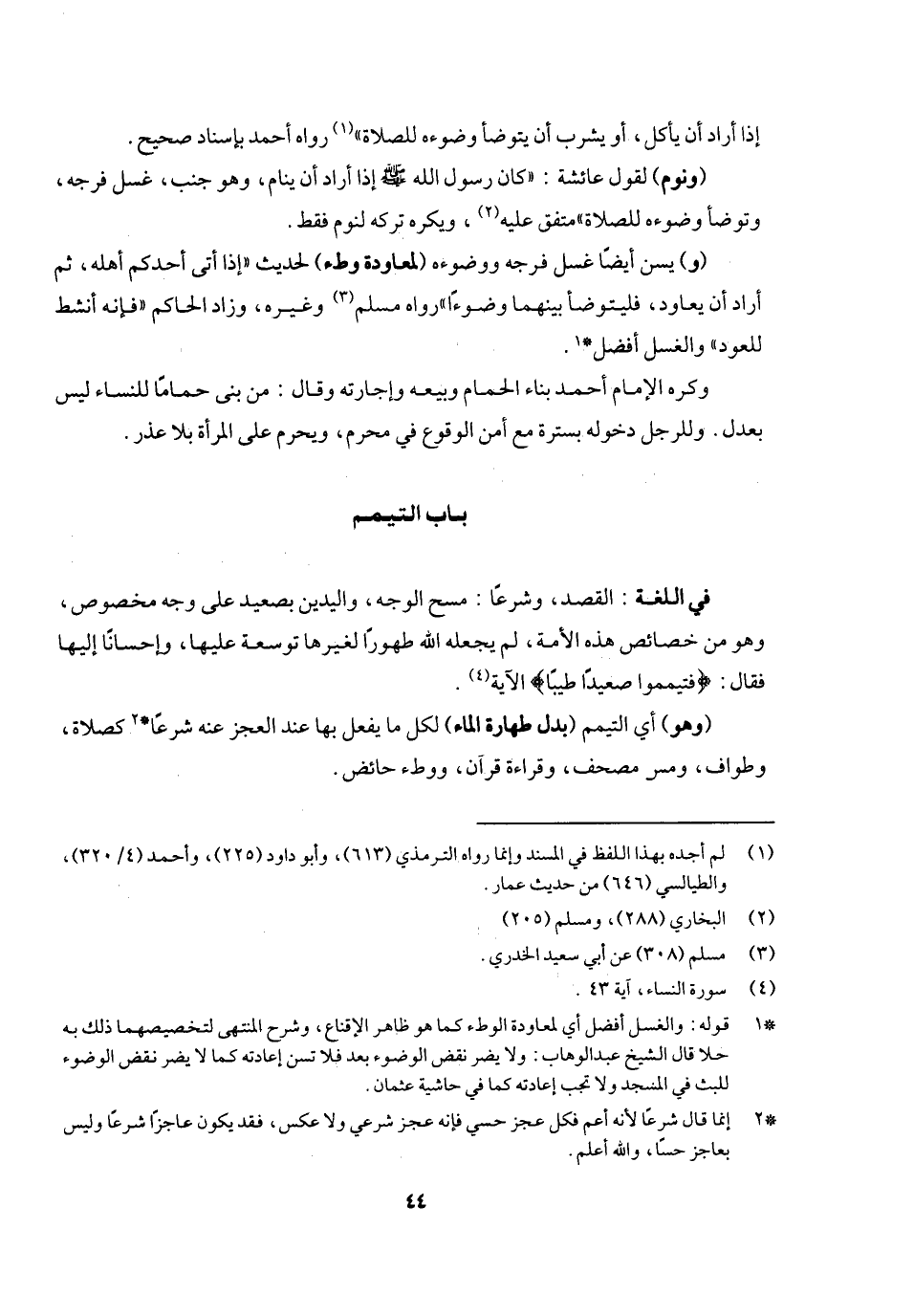 لقول عائشة: «كان رسول الله - صَلَّى اللَّهُ عَلَيْهِ وَسَلَّمَ - إذا أراد أن ينام وهو جنب غسل فرجه وتوضأ وضوءه للصلاة» متفق عليه، ويكره تركه لنوم فقط، (و) يسن أيضا غسل فرجه ووضوؤه (لمعاودة وطء) لحديث «إذا أتى أحدكم أهله ثم أراد أن يعاود فليتوضأ بينهما وضوءا» رواه مسلم وغيره وزاد الحاكم «فإنه أنشط للعود» والغسل أفضل، وكره الإمام أحمد بناء الحمام وبيعه وإجارته وقال: من بنى حماما للنساء ليس بعدل. وللرجل دخوله بسترة مع أمن الوقوع في محرم، ويحرم على المرأة بلا عذر.