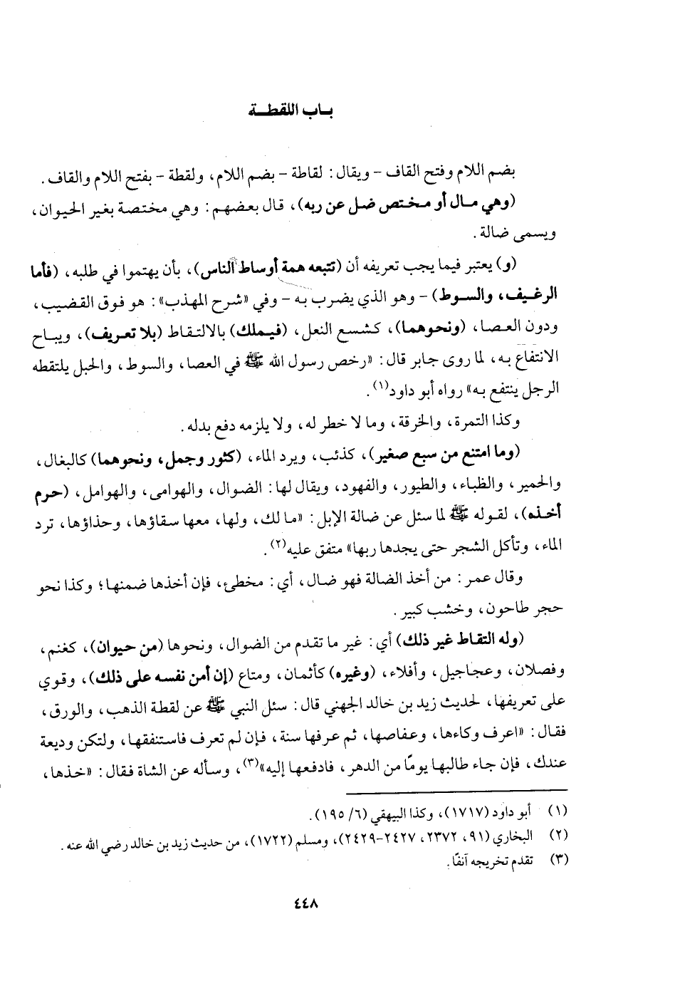 طلبه، (فأما الرغيف والسوط) وهو الذي يضرب به، وفي " شرح المهذب ": هو فوق القضيب ودون العصا (ونحوهما) كشسع نعل، (فيملك) بالالتقاط (بلا تعريف) ، ويباح الانتفاع به؛ لما روى جابر قال: «رخص رسول الله - صَلَّى اللَّهُ عَلَيْهِ وَسَلَّمَ - في العصا والسوط والحبل يلتقطه الرجل ينتفع به» رواه أبو داود، وكذا التمرة والخرقة وما لا خطر له ولا يلزمه دفع بدله.