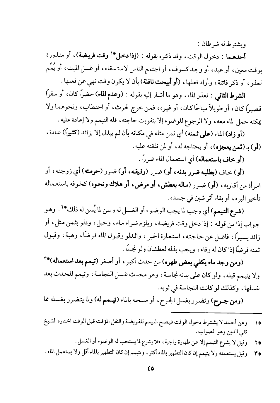 الشرط الثاني: تعذر الماء وهو ما أشار إليه بقوله: (وعدم الماء) حضرا كان أو سفرا قصيرا كان أو طويلا مباحا كان أو غيره، فمن خرج لحرث أو احتطاب ونحوهما ولا يمكنه حمل الماء معه ولا الرجوع للوضوء إلا بتفويت حاجته فله التيمم ولا إعادة عليه، (أو زاد) الماء (على ثمنه) أي ثمن مثله في مكانه بأن لم يبذل إلا بزائد (كثيرا) عادة (أو) بـ (ثمن يعجزه) أو يحتاجه له أو لمن نفقته عليه، (أو خاف باستعماله) أي باستعمال الماء ضررا