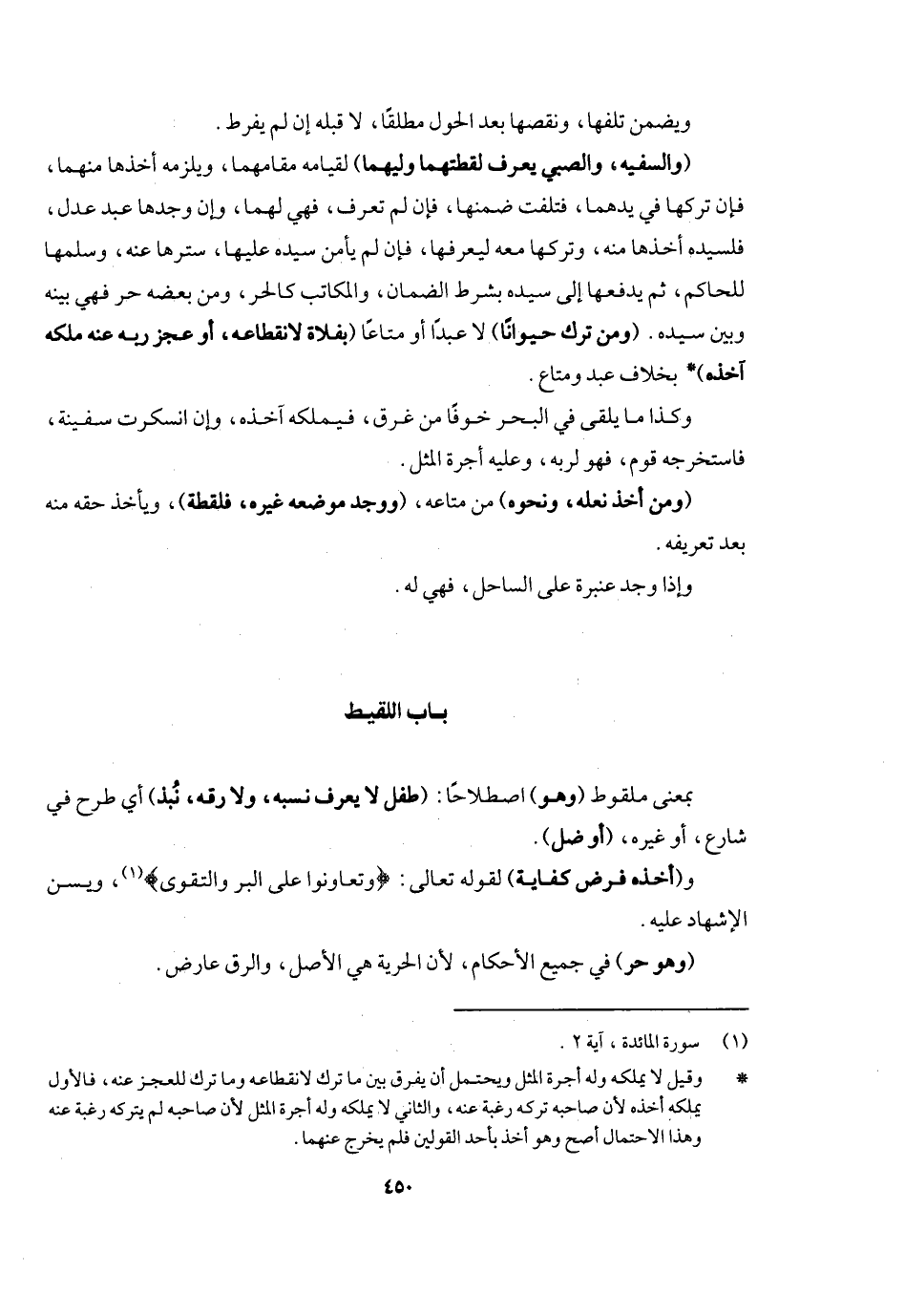 بمعنى ملقوط (وهو) اصطلاحا: (طفل لا يعرف نسبه ولا رقه، نبذ) أي: طرح في شارع أو غيره، (أو ضل) . (وأخذه فرض كفاية) ؛ لِقَوْلِهِ تَعَالَى: {وَتَعَاوَنُوا عَلَى الْبِرِّ وَالتَّقْوَى} [المائدة: ٢] . ويسن الإشهاد عليه، (وهو حر) في جميع الأحكام؛ لأن الحرية هي الأصل، والرق عارض.