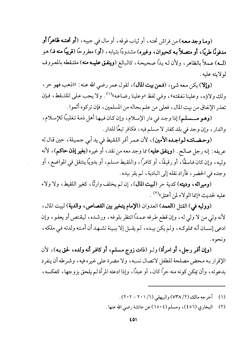(وإلا) يكن معه شيء (فمن بيت المال) لقول عمر - رَضِيَ اللَّهُ عَنْهُ -: ((اذهب فهو حر ولك ولاؤه وعلينا نفقته)) وفي لفظ ((وعلينا رضاعه)) . ولا يجب على الملتقط، فإن تعذر الإنفاق من بيت المال فعلى من علم حاله من المسلمين، فإن تركوه أثموا.