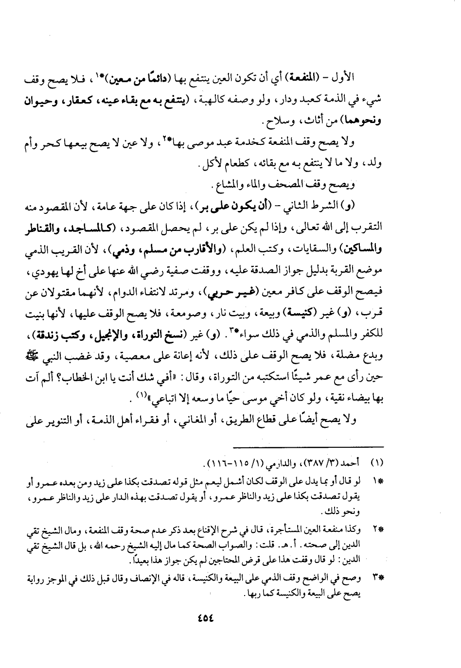 الأول ـ (المنفعة) أي أن تكون العين ينتفع بها (دائما مع معين) ، فلا يصح وقف شيء في الذمة كعبد ودار ولو وصفه كالهبة، (ينتفع به مع بقاء عينه، كعقار وحيوان ونحوهما) من أثاث وسلاح. ولا يصح وقف المنفعة كخدمة عبد موصى بها، ولا عين لا يصح بيعها كحر وأم ولد، ولا ما لا ينتفع به مع بقائه كطعام لأكل، ويصح وقف المصحف والماء المشاع.