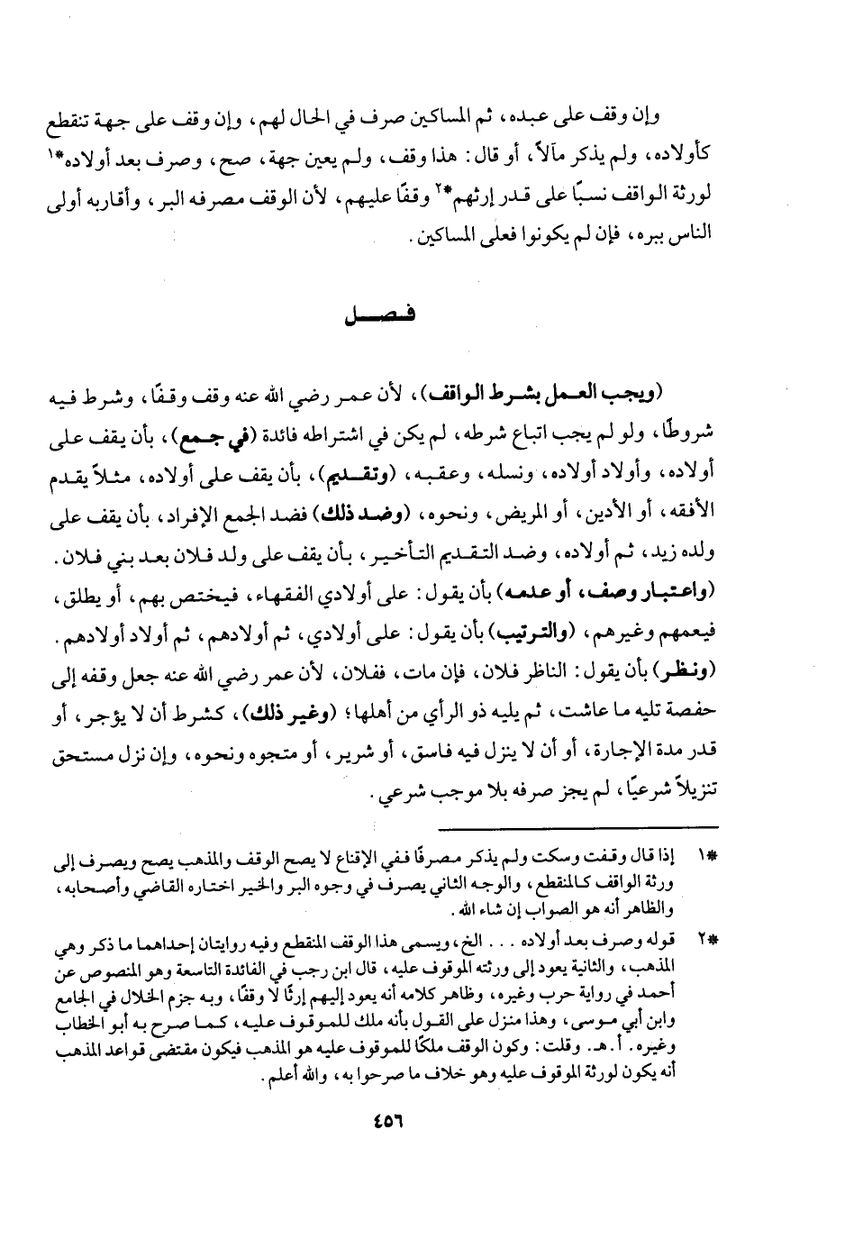 فصل (ويجب العمل بشرط الواقف) لأن عمر - رَضِيَ اللَّهُ عَنْهُ - وقف وقفا وشرط فيه شروطا، ولو لم يجب اتباع شرطه لم يكن في اشتراطه فائدة (في جمع) بأن يقف على أولاده وأولاد أولاده ونسله وعقبه، (وتقديم) بأن يقف على أولاده مثلا يقدم الأفقه أو الأدين أو المريض ونحوه، (وضد ذلك) فضد الجمع الإفراد، بأن يقف على ولده زيد ثم أولاده، وضد التقديم التأخير، بأن يقف على ولد فلان بعد بني فلان. (واعتبار وصف وعدمه) بأن يقول: على أولادي الفقهاء، فيختص بهم أو يطلق فيعمهم وغيرهم، (والترتيب) بأن يقول: على أولادي ثم أولادهم ثم أولادهم. (ونظر) بأن يقول: الناظر فلان، فإن مات ففلان، لأن عمر - رَضِيَ اللَّهُ عَنْهُ - جعل وقفه إلى حفصة تليه ما عاشت ثم يليه ذو الرأي من أهلها؛ (وغير ذلك) كشرط أن لا يؤجر، أو قدر مدة الإجارة أو أن لا ينزل فيه فاسق أو شرير أو متجوه ونحوه، وإن نزل مستحق تنزيلا شرعيا لم يجز صرفه بلا موجب شرعي،
