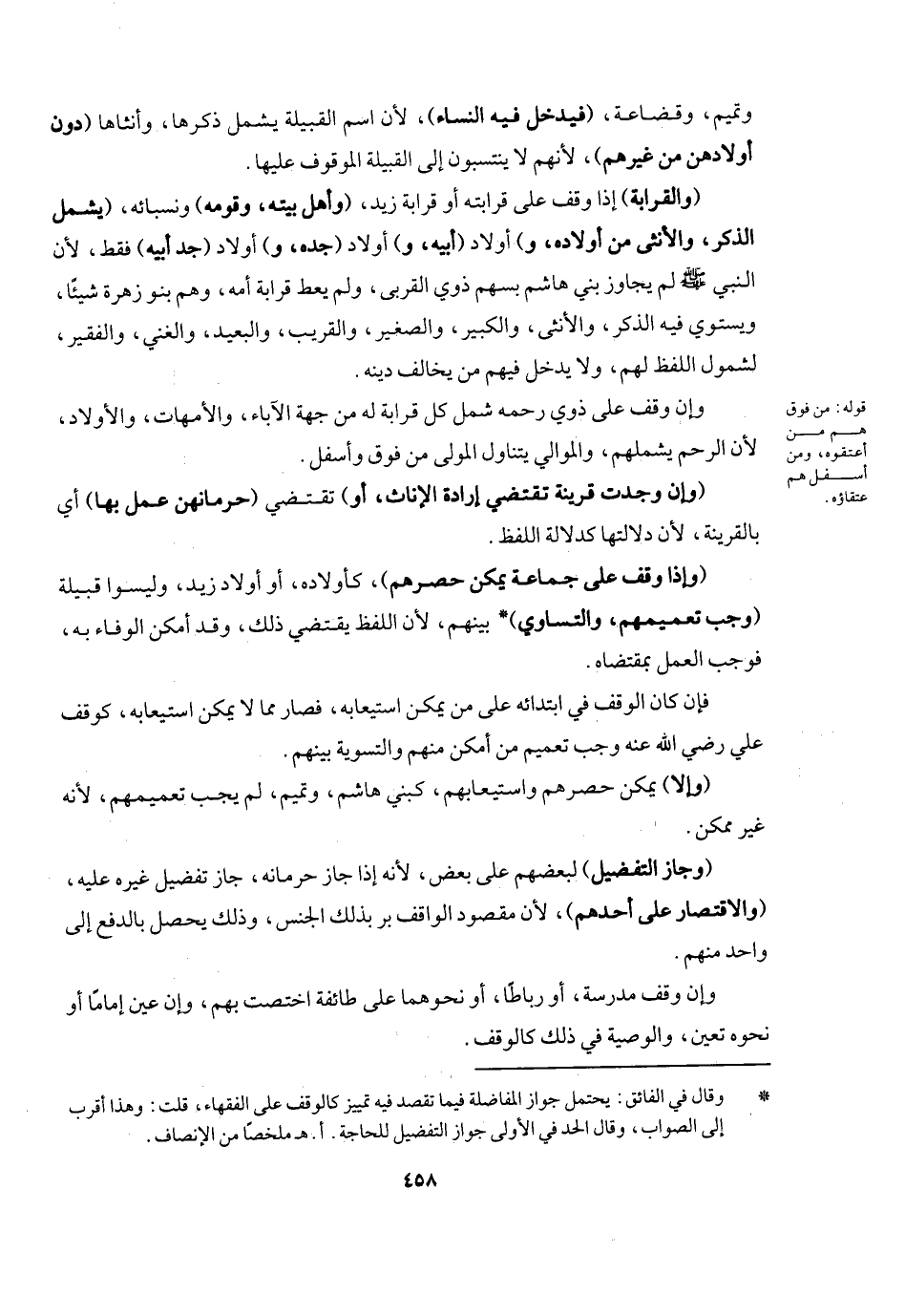 (وإذا وقف على جماعة يمكن حصرهم) كأولاده أو أولاد زيد وليسوا قبيلة (وجب تعميمهم والتساوي) بينهم، لأن اللفظ يقتضي ذلك وقد أمكن الوفاء به، فوجب العمل بمقتضاه، فإن كان الوقف في ابتدائه على من يمكن استيعابه فصار مما لا يمكن استيعابه كوقف علي - رَضِيَ اللَّهُ عَنْهُ - وجب تعميم من أمكن منهم والتساوي بينهم، (وإلا) : يمكن حصرهم واستيعابهم كبني هاشم وتميم لم يجب تعميمهم لأنه غير ممكن. و (جاز التفضيل) لبعضهم على بعض، لأنه إذا جاز حرمانه جاز تفضيل غيره عليه، (والاقتصار على أحدهم) لأن مقصود الواقف بر ذلك الجنس وذلك يحصل بالدفع إلى واحد منهم، وإن وقف مدرسة أو رباطا أو نحوهما على طائفة اختصت بهم، وإن عين إماما أو نحوه تعين، والوصية في ذلك كالوقف.