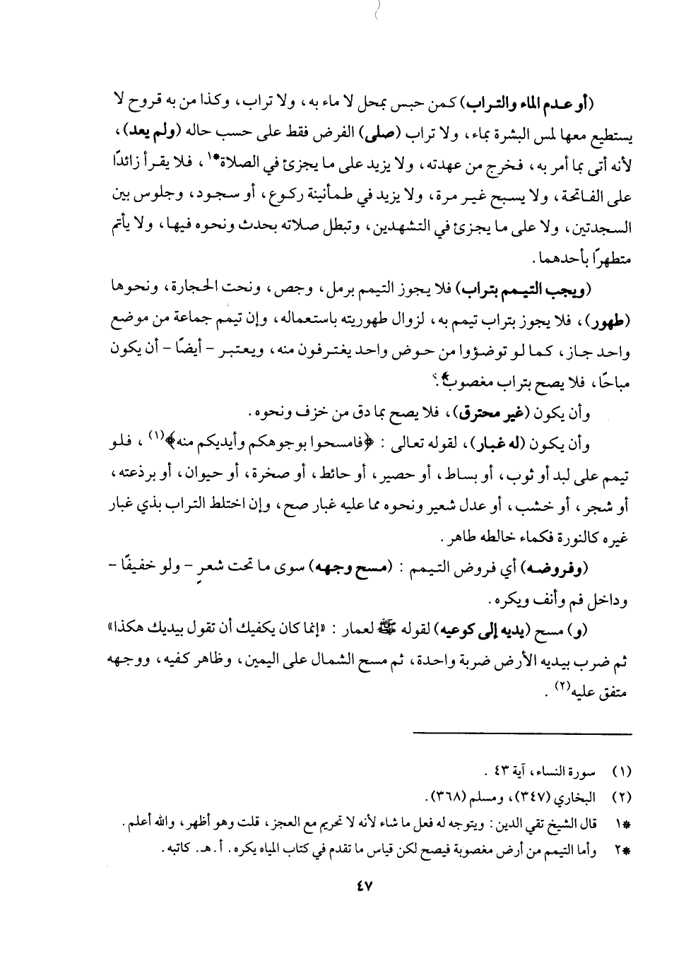 (أو عدم الماء والتراب) كمن حبس بمحل لا ماء به ولا تراب، وكذا من به قروح لا يستطيع معها لمس البشرة بماء ولا تراب (صلى) الفرض فقط على حسب حاله (ولم يعد) لأنه أتى بما أمر به فخرج من عهدته، ولا يزيد على ما يجزئ في الصلاة فلا يقرأ زائدا على الفاتحة، ولا يسبح غير مرة، ولا يزيد في طمأنينة ركوع أو سجود وجلوس بين السجدتين، ولا على ما يجزئ في التشهدين، وتبطل صلاته بحدث ونحوه فيها، ولا يؤم متطهرا بأحدهما.
