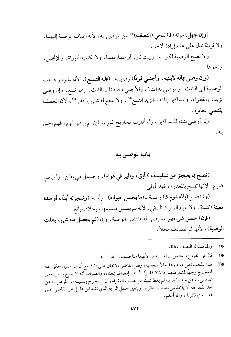 (تصح الوصية بما يعجز عن تسليمه كآبق وطير في هواء) وحمل في بطن ولبن في ضرع لأنها تصح بالمعدوم فهذا أولى. (و) تصح (بالمعدوم كـ) وصية بـ (ما يحمل حيوانه) وأمته (وشجرته أبدا أو مدة معينة) كسنة. ولا يلزم الوارث السقي لأنه لم يضمن تسليمها بخلاف بائع، (فإن) حصل شيء فهو للموصي له بمقتضى الوصية، وإن (لم يحصل منه شيء بطلت الوصية) لأنها لم تصادف محلا.
